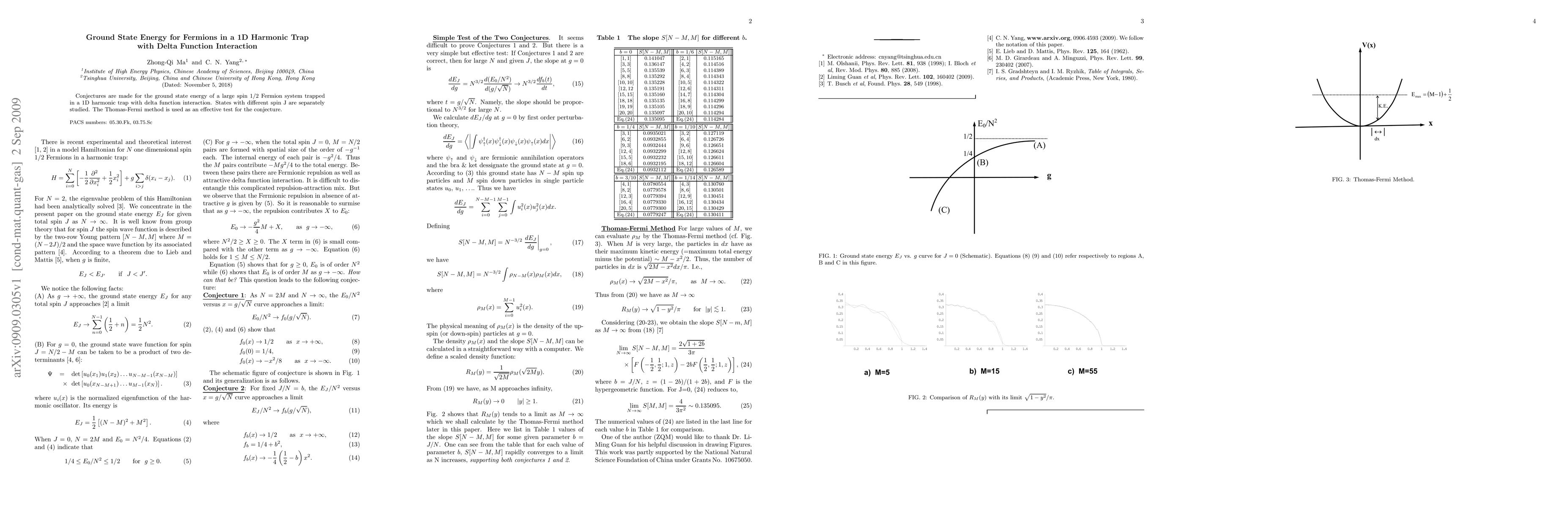 Summary: This paper conjectures the ground state energy for large spin 1/2 fermions in a 1D harmonic trap with delta function interaction, studying different spin states separately, and validates the conjecture using the Thomas-Fermi method.