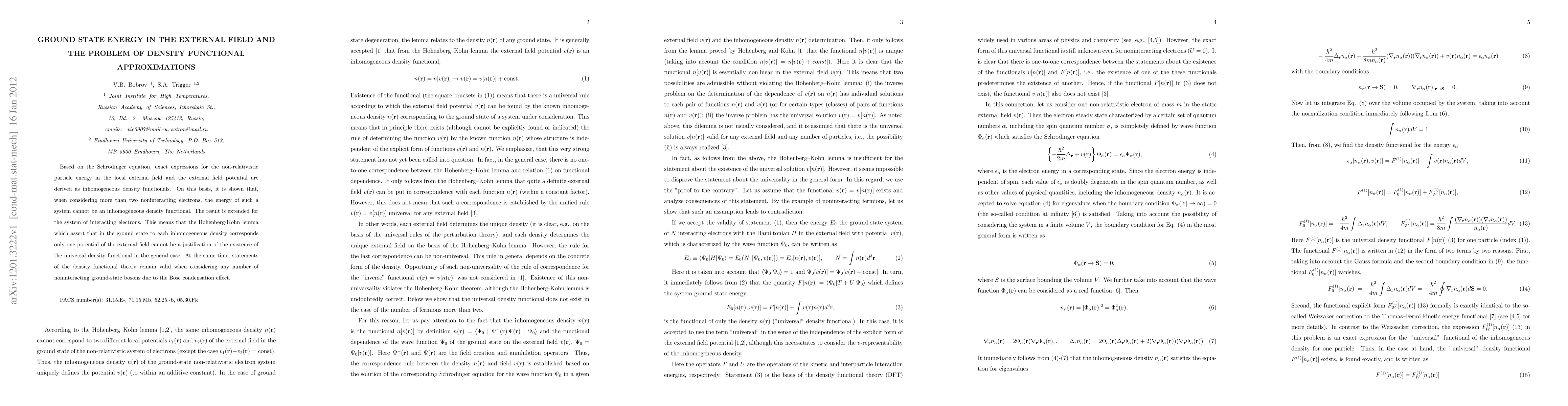 This paper derives exact expressions for non-relativistic particle energy in external fields and argues that the energy of systems with more than two noninteracting electrons cannot be represented as inhomogeneous density functionals. The study concludes that the Hohenberg-Kohn lemma does not support the existence of a universal density functional for interacting electron systems.