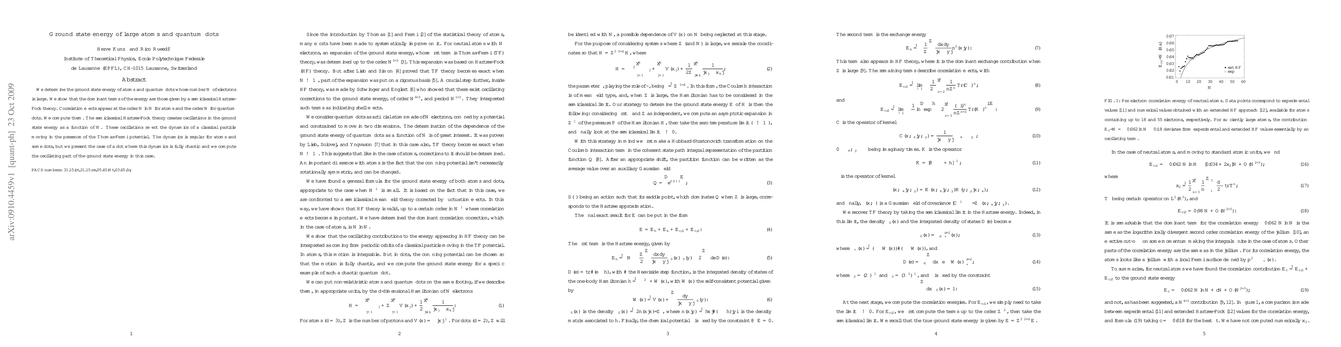 This paper determines the ground state energy of large atoms and quantum dots, showing that semiclassical Hartree-Fock theory dominates. It identifies correlation effects at orders N ln N for atoms and N for quantum dots, and computes these effects, revealing chaotic dynamics in certain quantum dots that lead to oscillations in ground state energy.