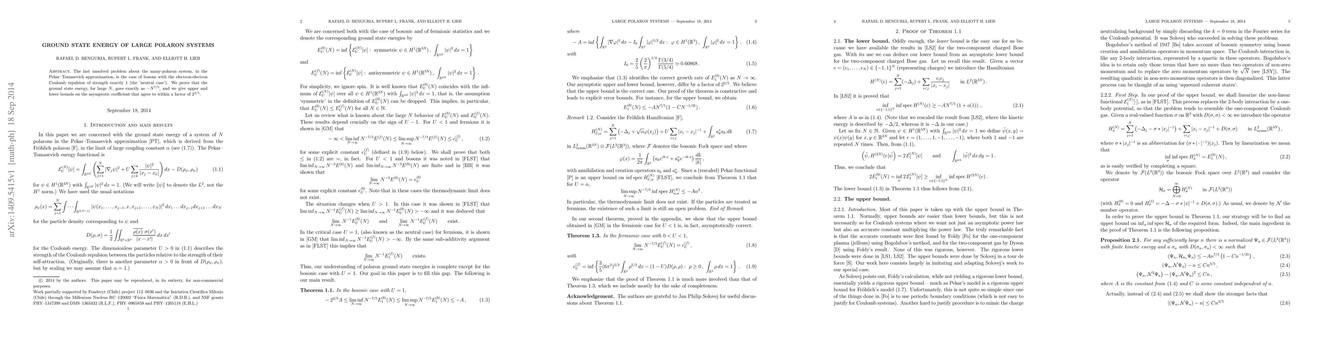 The paper resolves the longstanding issue regarding the ground state energy of large polaron systems in the neutral case, proving that it scales as $-N^{7/5}$ for large $N$ and provides bounds on the asymptotic coefficient accurate to within a factor of $2^{2/5}$.