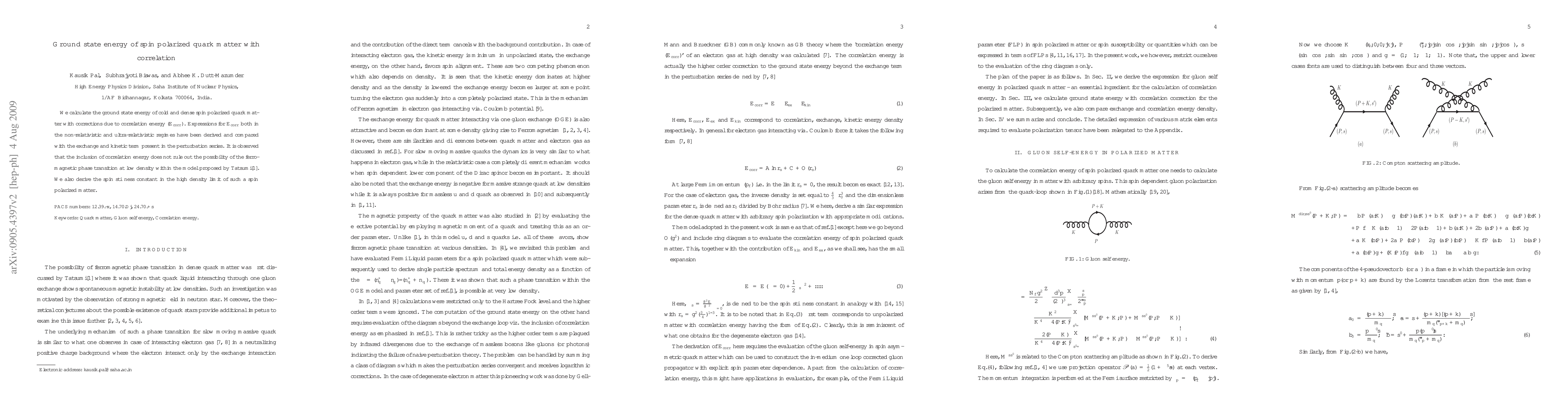 This paper calculates the ground state energy of spin polarized quark matter, incorporating correlation energy corrections in both non-relativistic and ultra-relativistic regimes. It finds that correlation energy does not preclude a ferromagnetic phase transition at low density, supporting the Tatsumi model, and derives the spin stiffness constant in high density conditions.
