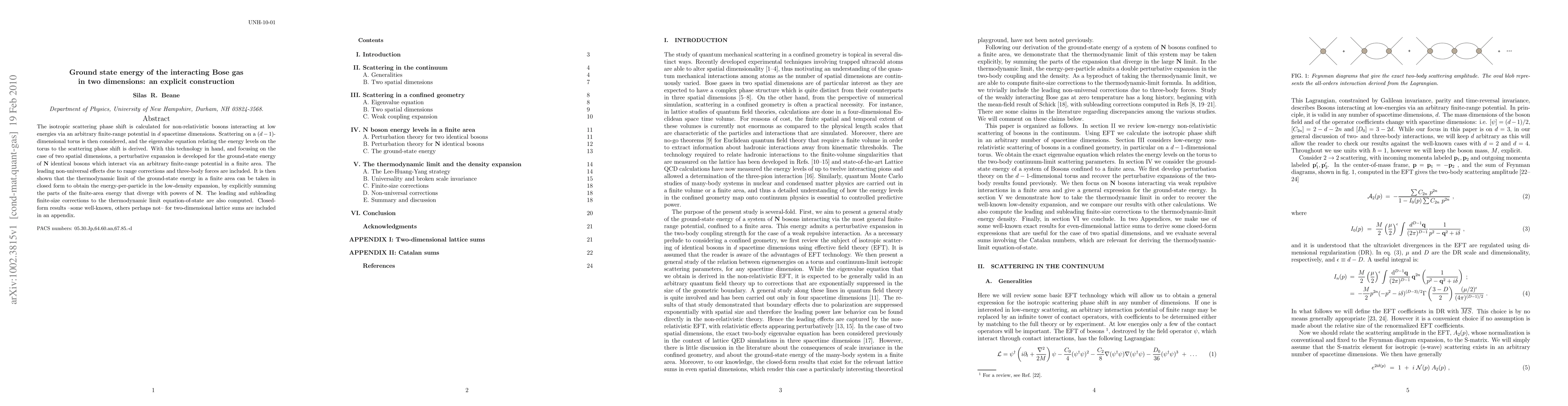 The isotropic scattering phase shift is calculated for non-relativistic bosons interacting at low energies via an arbitrary finite-range potential in d spacetime dimensions. Scattering on a (d-1)-dimensional torus is then considered, and the eigenvalue equation relating the energy levels on the torus to the scattering phase shift is derived. With this technology in hand, and focusing on the case of two spatial dimensions, a perturbative expansion is developed for the ground-state energy of N identical bosons which interact via an arbitrary finite-range potential in a finite area. The leading non-universal effects due to range corrections and three-body forces are included. It is then shown that the thermodynamic limit of the ground-state energy in a finite area can be taken in closed form to obtain the energy-per-particle in the low-density expansion, by explicitly summing the parts of the finite-area energy that diverge with powers of N. The leading and subleading finite-size corrections to the thermodynamic limit equation-of-state are also computed. Closed-form results --some well-known, others perhaps not-- for two-dimensional lattice sums are included in an appendix.