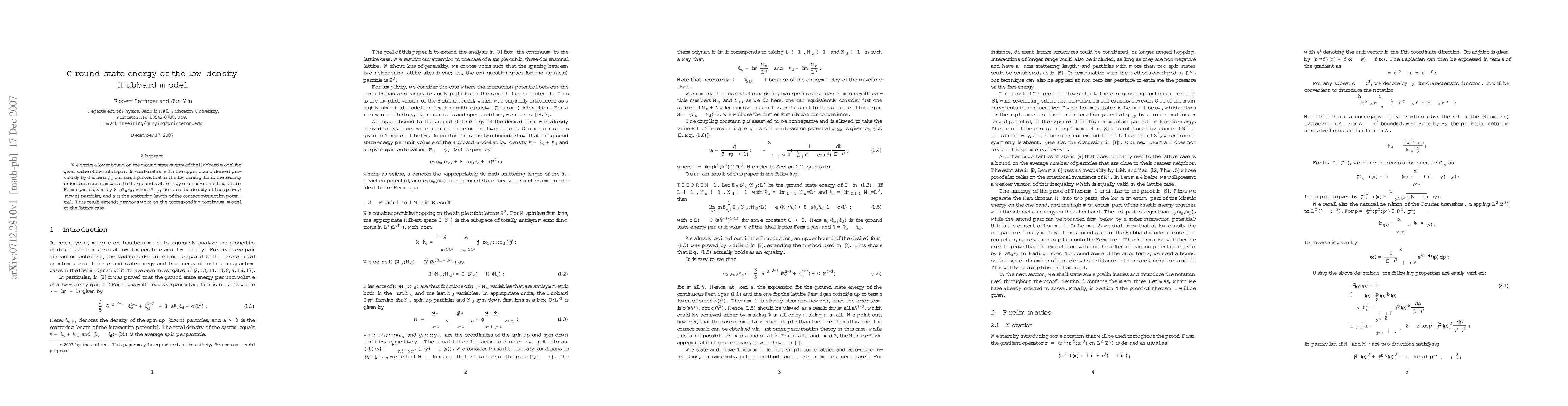 This paper establishes a lower bound for the ground state energy of the low density Hubbard model, providing a complete picture when combined with Giuliani's upper bound. The result shows that the leading correction in the low density limit is $8\pi a \rho_u \rho_d$, extending continuum model findings to the lattice case.