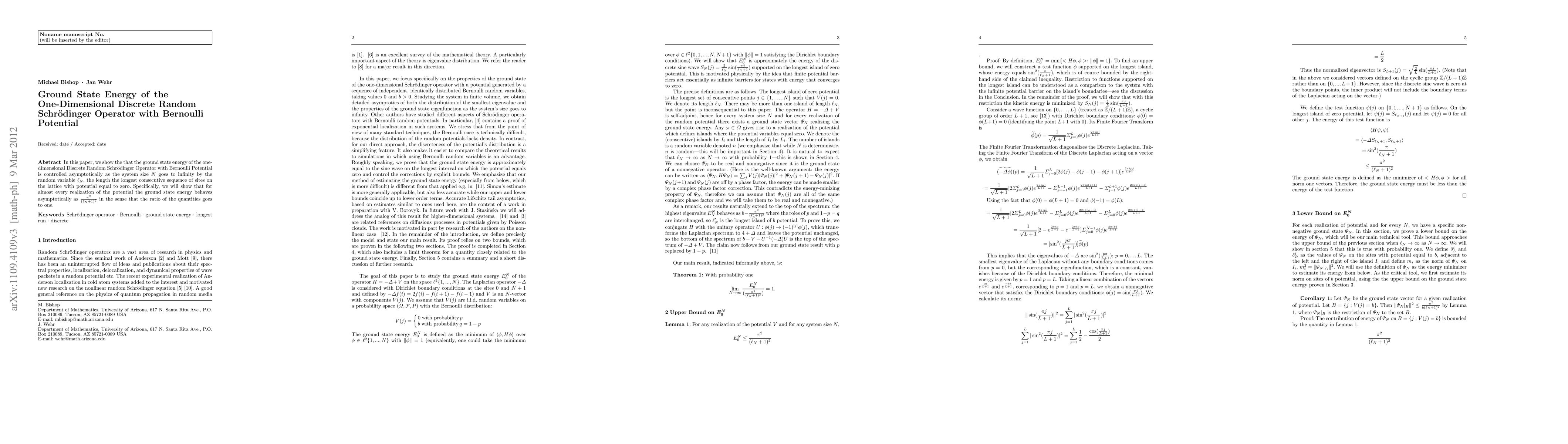In this paper, we show the that the ground state energy of the one dimensional Discrete Random Schroedinger Operator with Bernoulli Potential is controlled asymptotically as the system size N goes to infinity by the random variable \ell_N, the length the longest consecutive sequence of sites on the lattice with potential equal to zero. Specifically, we will show that for almost every realization of the potential the ground state energy behaves asymptotically as $\frac{\pi^2}{\ell_N+1)^2}$ in the sense that the ratio of the quantities goes to one.