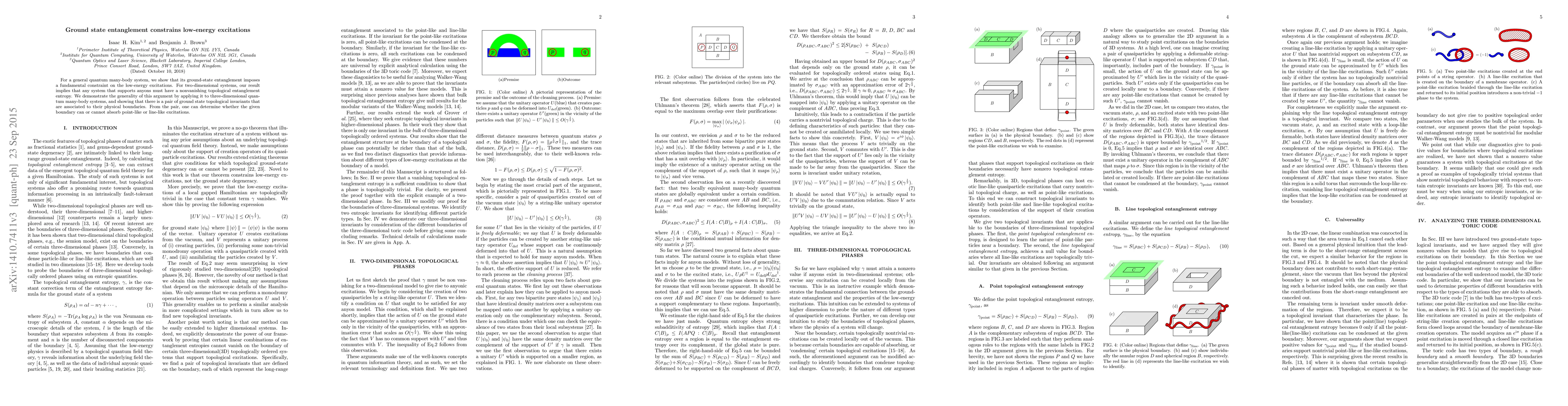 This paper demonstrates that ground-state entanglement fundamentally constrains the low-energy excitations of quantum many-body systems, particularly showing that anyons require nonvanishing topological entanglement entropy in two dimensions. It extends this argument to three-dimensional systems, revealing pairs of ground state topological invariants that determine the absorption of excitations at physical boundaries.