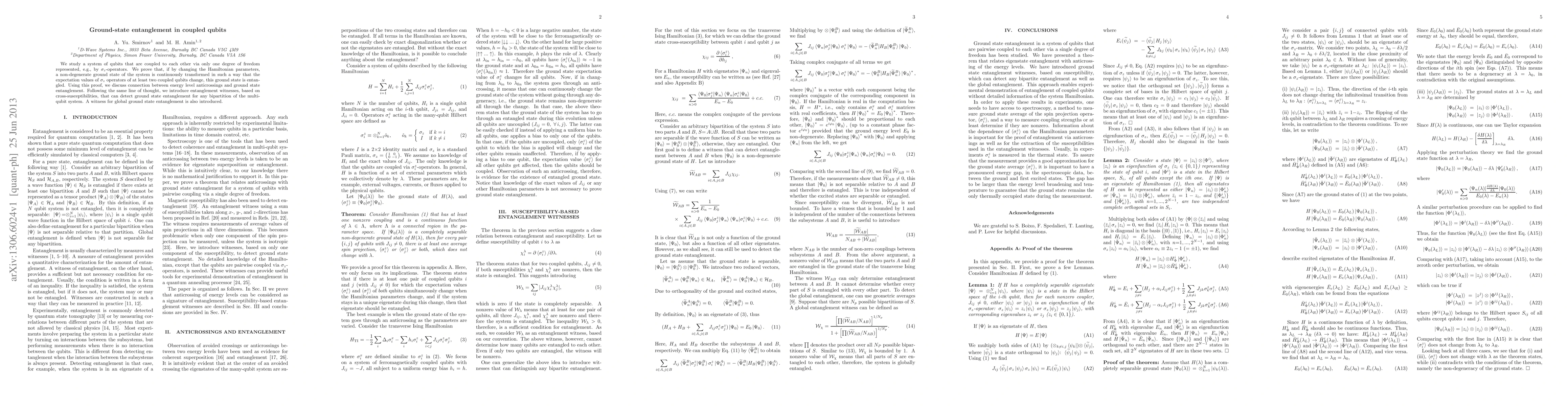 We study a system of qubits that are coupled to each other via only one degree of freedom represented, e.g., by $\sigma_z$-operators. We prove that, if by changing the Hamiltonian parameters, a non-degenerate ground state of the system is continuously transformed in such a way that the expectation values of $\sigma_z$ operators of at least two coupled qubits change, this ground state is entangled. Using this proof, we discuss connection between energy level anticrossings and ground state entanglement. Following the same line of thought, we introduce entanglement witnesses, based on cross-susceptibilities, that can detect ground state entanglement for any bipartition of the multi-qubit system. A witness for global ground state entanglement is also introduced.