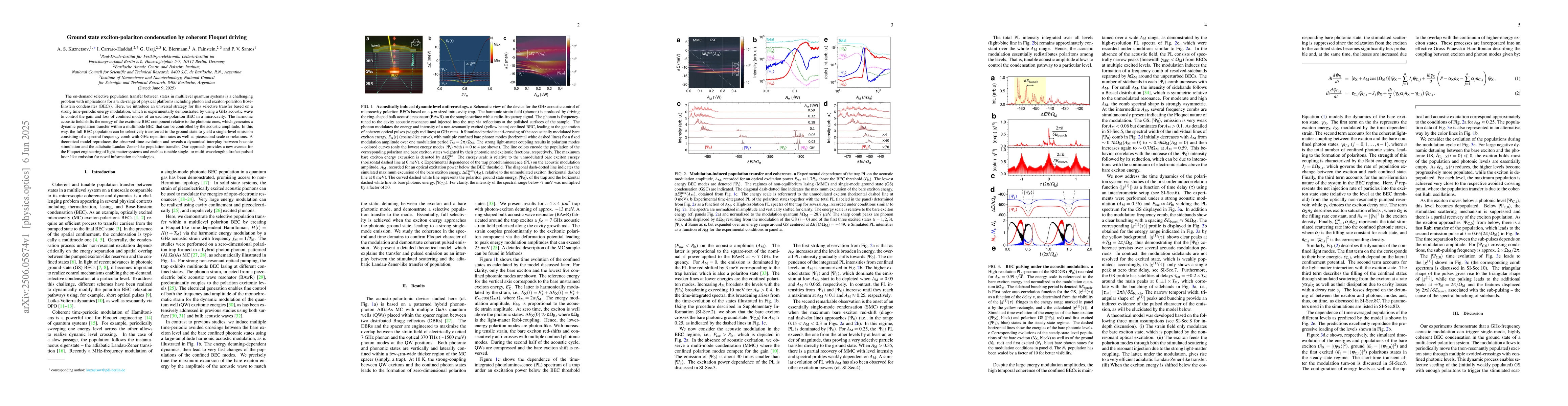 The on-demand selective population transfer between states in multilevel quantum systems is a challenging problem with implications for a wide-range of physical platforms including photon and exciton-polariton Bose- Einstein condensates (BECs). Here, we introduce an universal strategy for this selective transfer based on a strong time-periodic energy modulation, which is experimentally demonstrated by using a GHz acoustic wave to control the gain and loss of confined modes of an exciton-polariton BEC in a microcavity. The harmonic acoustic field shifts the energy of the excitonic BEC component relative to the photonic ones, which generates a dynamic population transfer within a multimode BEC that can be controlled by the acoustic amplitude. In this way, the full BEC population can be selectively transferred to the ground state to yield a single-level emission consisting of a spectral frequency comb with GHz repetition rates as well as picosecond-scale correlations. A theoretical model reproduces the observed time evolution and reveals a dynamical interplay between bosonic stimulation and the adiabatic Landau-Zener-like population transfer. Our approach provides a new avenue for the Floquet engineering of light-matter systems and enables tunable single- or multi-wavelength ultrafast pulsed laser-like emission for novel information technologies.