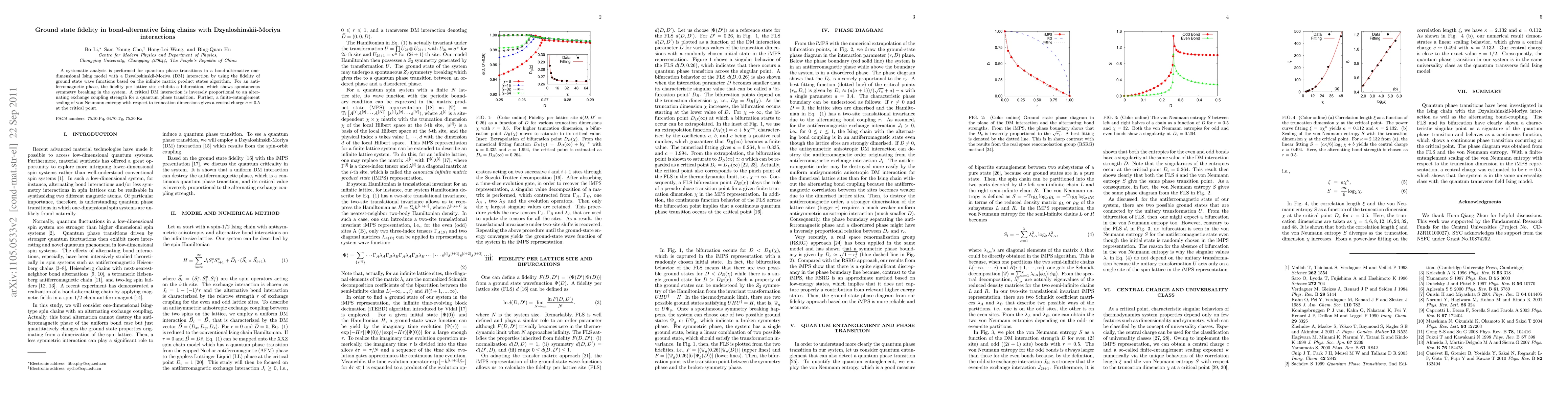 A systematic analysis is performed for quantum phase transitions in a bond-alternative one-dimensional Ising model with a Dzyaloshinskii-Moriya (DM) interaction by using the fidelity of ground state wave functions based on the infinite matrix product states algorithm. For an antiferromagnetic phase, the fidelity per lattice site exhibits a bifurcation, which shows spontaneous symmetry breaking in the system. A critical DM interaction is inversely proportional to an alternating exchange coupling strength for a quantum phase transition. Further, a finite-entanglement scaling of von Neumann entropy with respect to truncation dimensions gives a central charge c = 0.5 at the critical point.