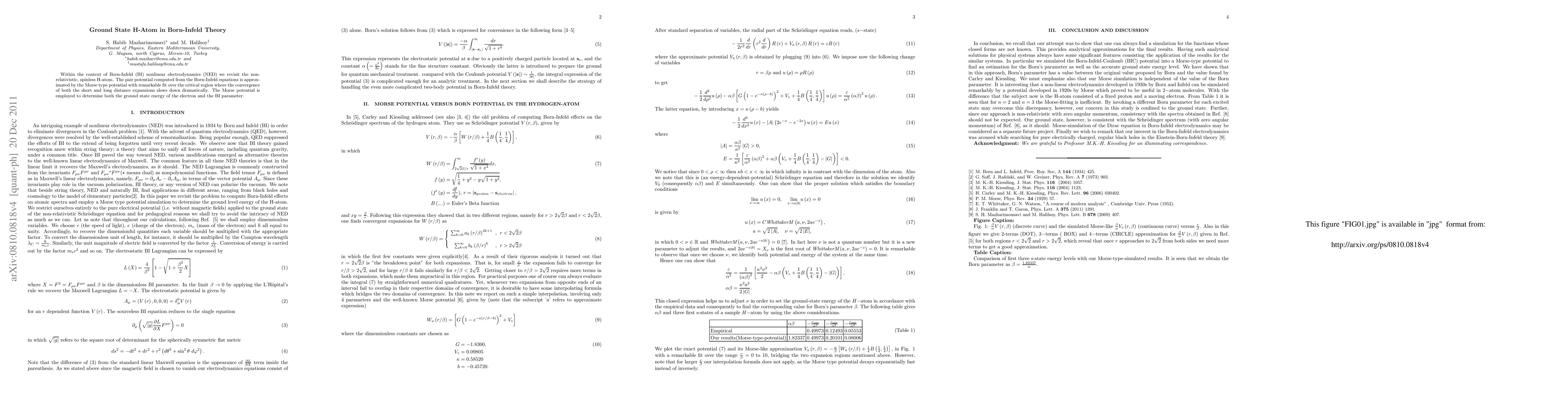 Researchers studied the ground state of a hydrogen atom in Born-Infeld theory, using an approximation that closely matches a Morse potential to calculate energy levels.