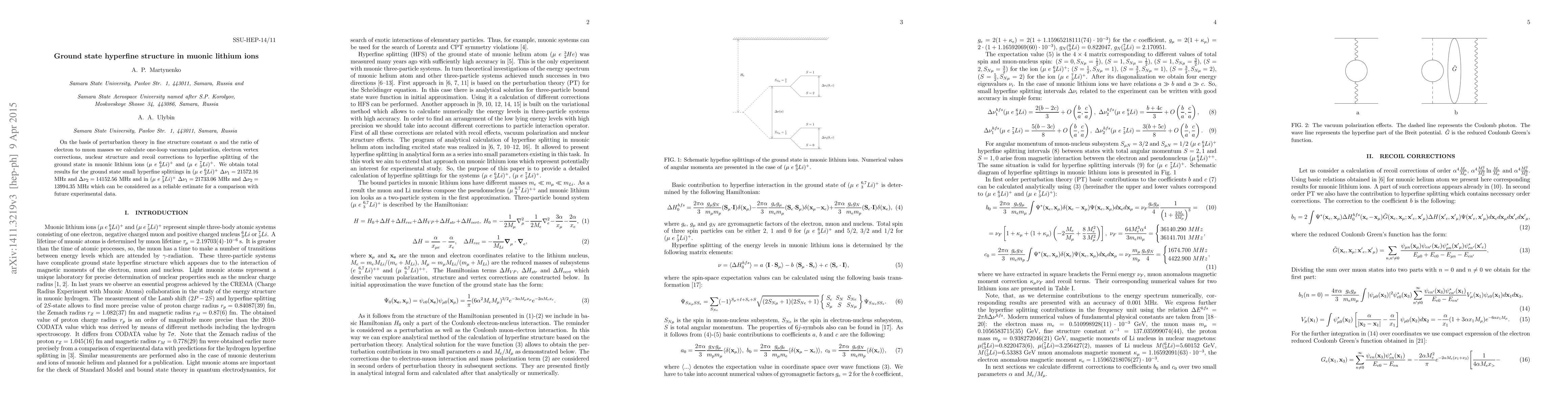 On the basis of perturbation theory in fine structure constant alpha and the ratio of electron to muon masses we calculate one-loop vacuum polarization, electron vertex corrections, nuclear structure and recoil corrections to hyperfine splitting of the ground state in muonic lithium ions $(\mu\ e\ ^6_3Li)^+$ and $(\mu\ e\ ^7_3Li)^+$. We obtain total results for the ground state small hyperfine splittings in $(\mu\ e\ ^6_3Li)^+$ $\Delta\nu_1=21572.16$ MHz and $\Delta\nu_2=14152.56$ MHz and in $(\mu\ e\ ^7_3Li)^+$ $\Delta\nu_1=21733.06$ MHz and $\Delta\nu_2=13994.35$ MHz which can be considered as a reliable estimate for a comparison with future experimental data.
