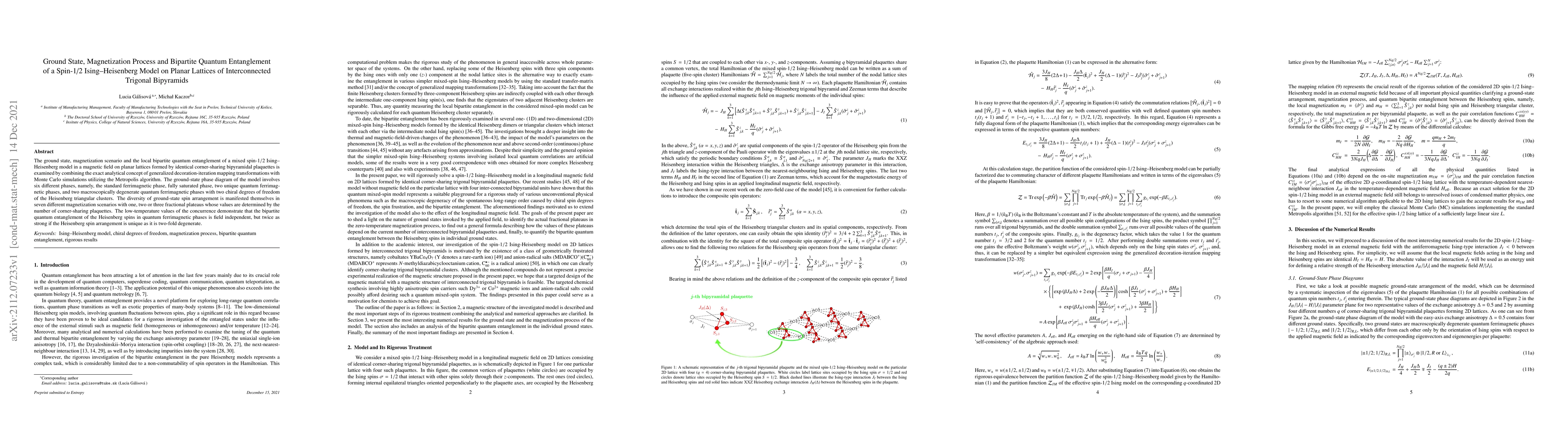 This paper investigates the ground state, magnetization, and bipartite quantum entanglement in a spin-1/2 Ising-Heisenberg model on planar lattices of interconnected trigonal bipyramids, revealing six distinct phases and seven magnetization scenarios, with unique quantum entanglement properties in different phases.
