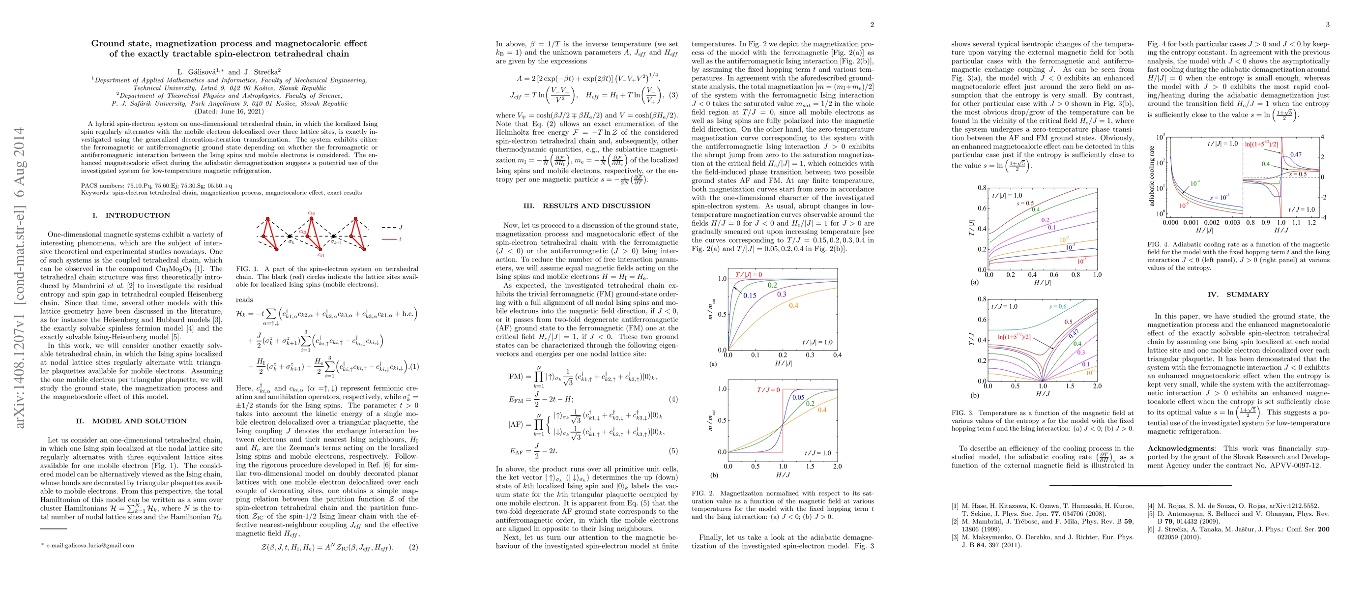 A hybrid spin-electron system on one-dimensional tetrahedral chain, in which the localized Ising spin regularly alternates with the mobile electron delocalized over three lattice sites, is exactly investigated using the generalized decoration-iteration transformation. The system exhibits either the ferromagnetic or antiferromagnetic ground state depending on whether the ferromagnetic or antiferromagnetic interaction between the Ising spins and mobile electrons is considered. The enhanced magnetocaloric effect during the adiabatic demagnetization suggests a potential use of the investigated system for low-temperature magnetic refrigeration.