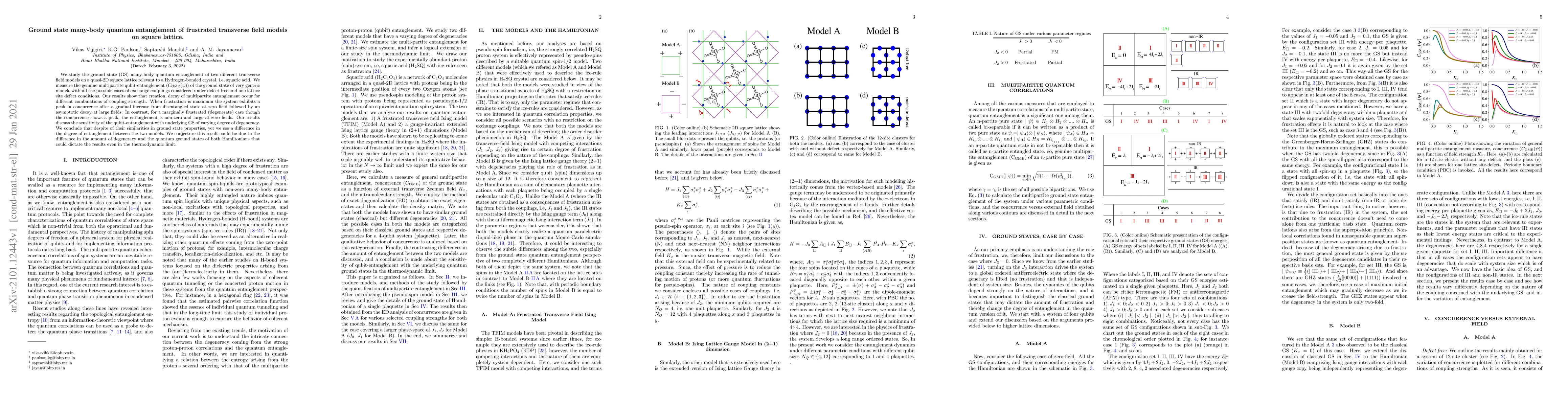 We study the ground state (GS) many-body quantum entanglement of two different transverse field models on a quasi-2D square lattice relevant to a Hydrogen-bonded crystal, i.e, squaric acid. We measure the genuine multipartite qubit-entanglement ($C_{\text{GME}}(\psi)$) of the ground state of very generic models with all the possible cases of exchange couplings considered under defect free and one lattice site defect conditions. Our results show that creation, decay of multipartite entanglement occur for different combinations of coupling strength. When frustration is maximum the system exhibits a peak in concurrence after a gradual increase from disentangled state at zero field followed by an asymptotic decay at large fields. In contrast, for a marginally frustrated (degenerate) case though the concurrence shows a peak, the entanglement is non-zero and large at zero fields. Our results discuss the sensitivity of the qubit-entanglement with underlying GS of varying degree of degeneracy. We conclude that despite of their similarities in ground state properties, yet we see a difference in the degree of entanglement between the two models. We conjecture this result could be due to the difference in the amount of degeneracy and the quantum ground states of both Hamiltonians that could dictate the results even in the thermodynamic limit.