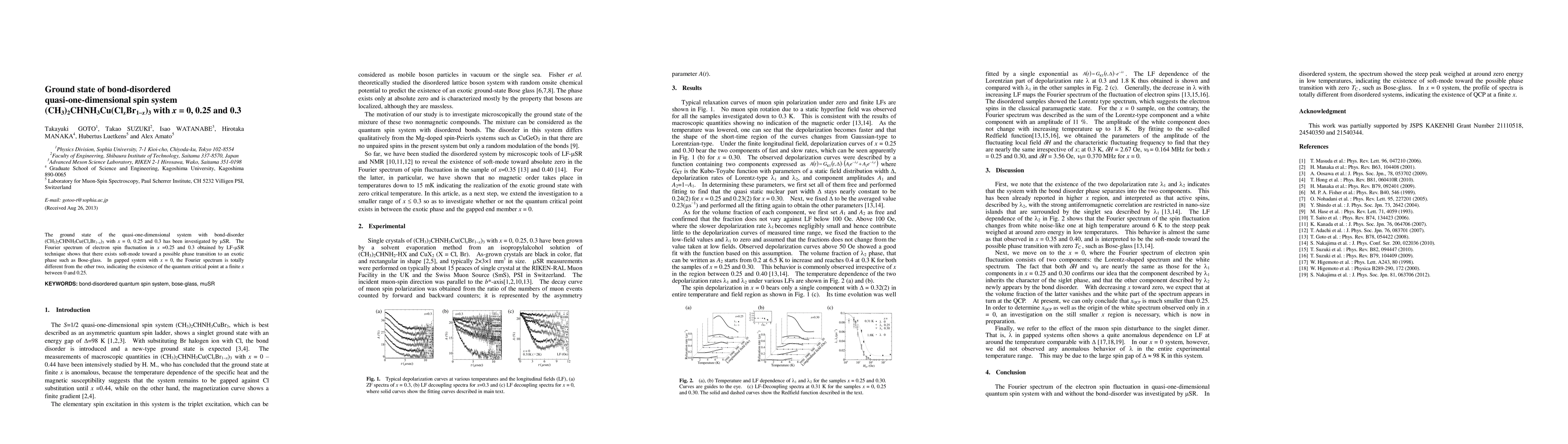 The ground state of the quasi-one-dimensional system with bond-disorder (CH3)2CHNH3Cu(ClxBr1-x)3 with x = 0, 0.25 and 0.3 has been investigated by muSR. The Fourier spectrum of electron spin fluctuation in x =0.25 and 0.3 obtained by LF-muSR technique shows that there exists a soft-mode toward a possible phase transition to an exotic phase such as Bose-glass. In gapped system with x = 0, the Fourier spectrum is totally different from the other two, indicating the existence of the quantum critical point at a finite x between 0 and 0.25.