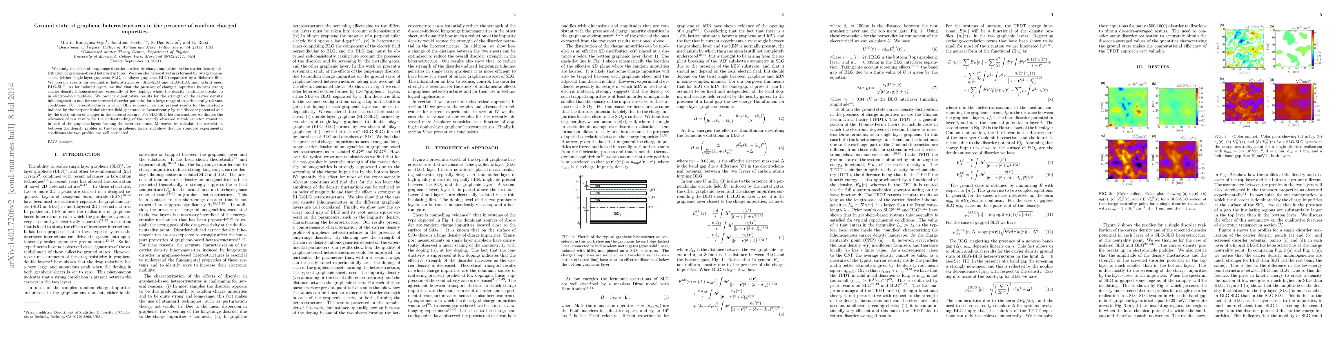This paper investigates how long-range disorder from charged impurities affects carrier density in graphene heterostructures, revealing strong inhomogeneities and puddle formation, especially at low doping levels. It also discusses implications for metal-insulator transitions and correlation between density profiles in graphene layers.