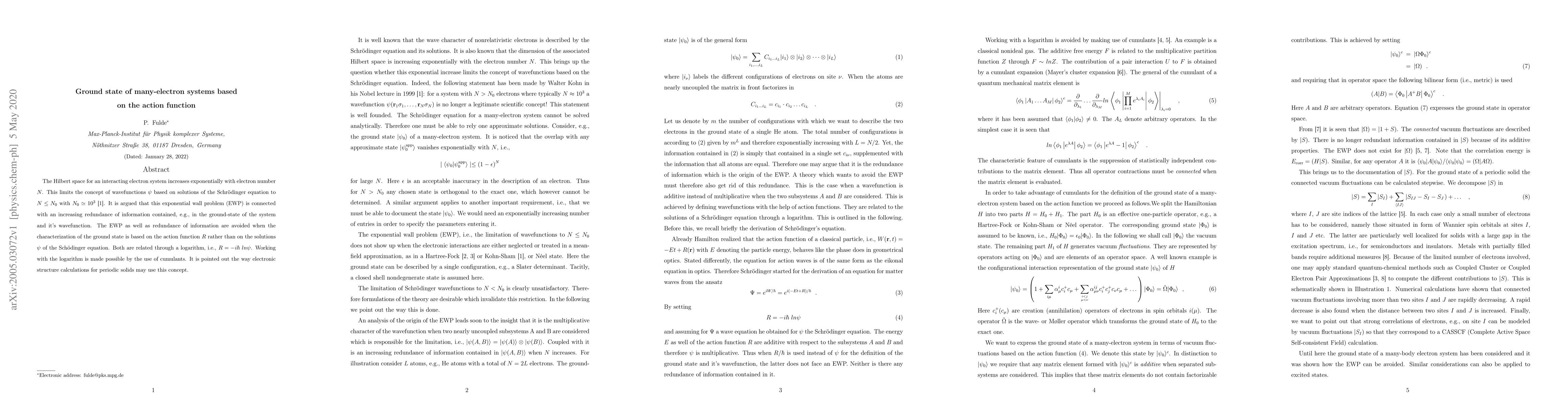 The Hilbert space for an interacting electron system increases exponentially with electron number $N$. This limits the concept of wavefunctions $\psi$ based on solutions of the Schr\"odinger equation to $N \leq N_0$ with $N_0 \simeq 10^3$ \cite{Kohn1999}. It is argued that this exponential wall problem (EWP) is connected with an increasing redundance of information contained, e.g., in the ground-state of the system and it's wavefunction. The EWP as well as redundance of information are avoided when the characterization of the ground state is based on the action function $R$ rather than on the solutions $\psi$ of the Sch\"odinger equation. Both are related through a logarithm, i.e., $R = -i \hbar \ ln \psi$. Working with the logarithm is made possible by the use of cumulants. It is pointed out the way electronic structure calculations for periodic solids may use this concept.