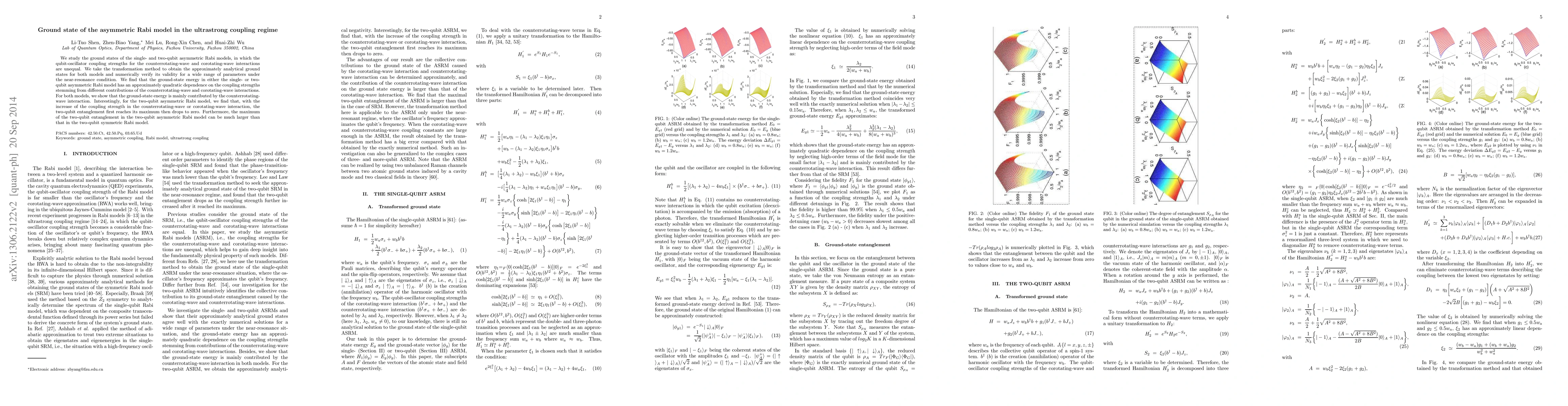 This paper investigates the ground states of single- and two-qubit asymmetric Rabi models under ultrastrong coupling, revealing a quadratic dependence of ground-state energy on coupling strengths. The study finds that the counterrotating-wave interaction predominantly contributes to the ground-state energy, and in the two-qubit case, entanglement reaches a maximum before diminishing.