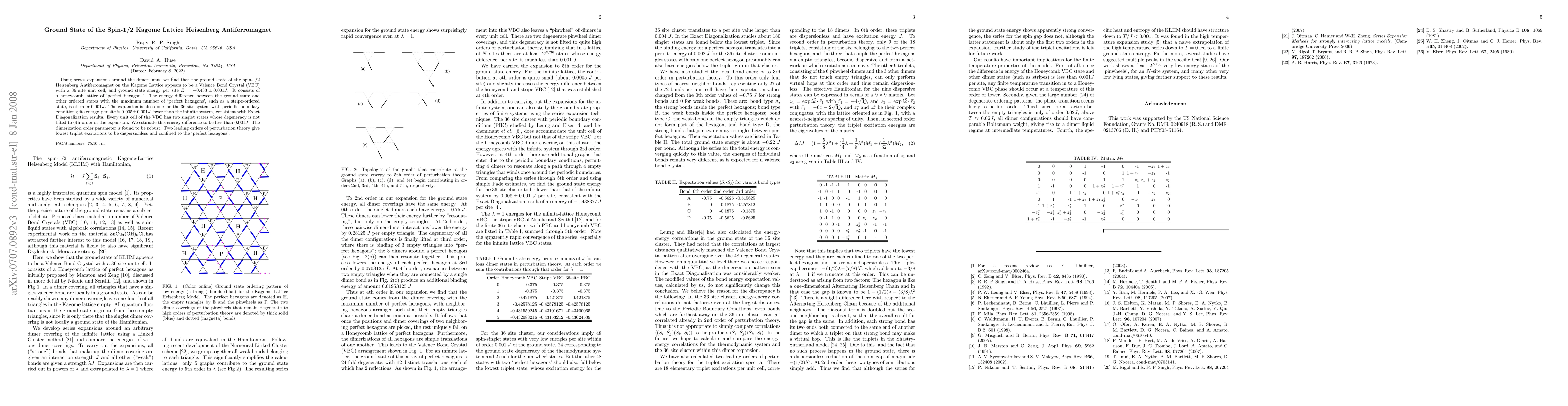 The ground state of the Heisenberg Antiferromagnet on the Kagome Lattice is identified as a Valence Bond Crystal (VBC) with a 36-site unit cell, characterized by a honeycomb lattice of perfect hexagons. The energy difference between this state and other ordered states is minimal, suggesting strong stability.