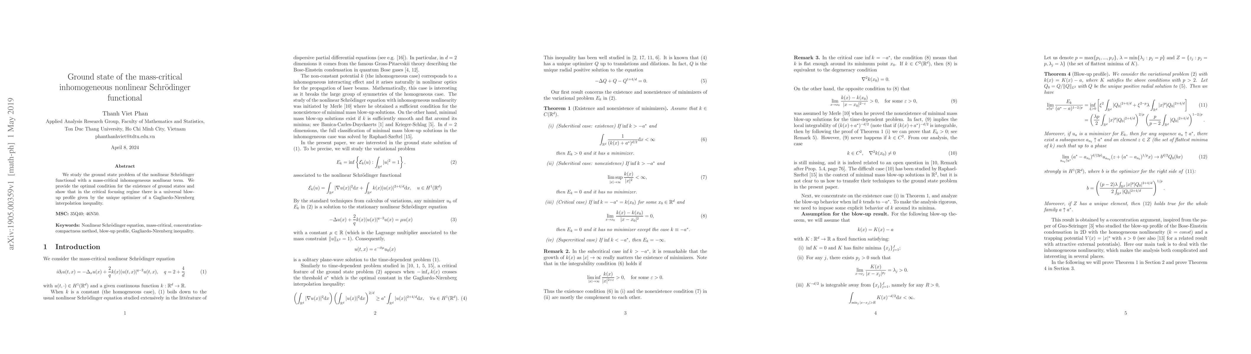 We study the ground state problem of the nonlinear Schrodinger functional with a mass-critical inhomogeneous nonlinear term. We provide the optimal condition for the existence of ground states and show that in the critical focusing regime there is a universal blow-up profile given by the unique optimizer of a Gagliardo-Nirenberg interpolation inequality.