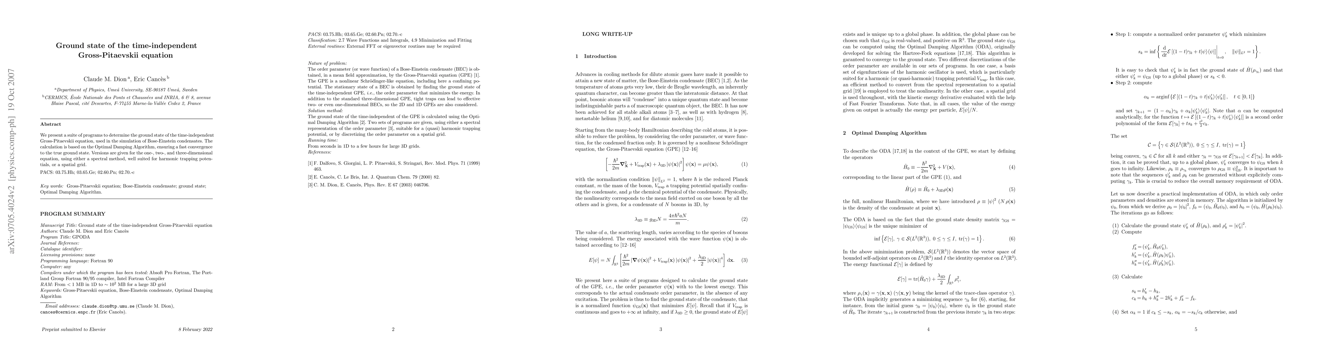 This paper introduces a suite of computational programs for determining the ground state of the time-independent Gross-Pitaevskii equation, employing the Optimal Damping Algorithm for rapid convergence. It provides versions for one-, two-, and three-dimensional simulations, utilizing either spectral methods or spatial grids.
