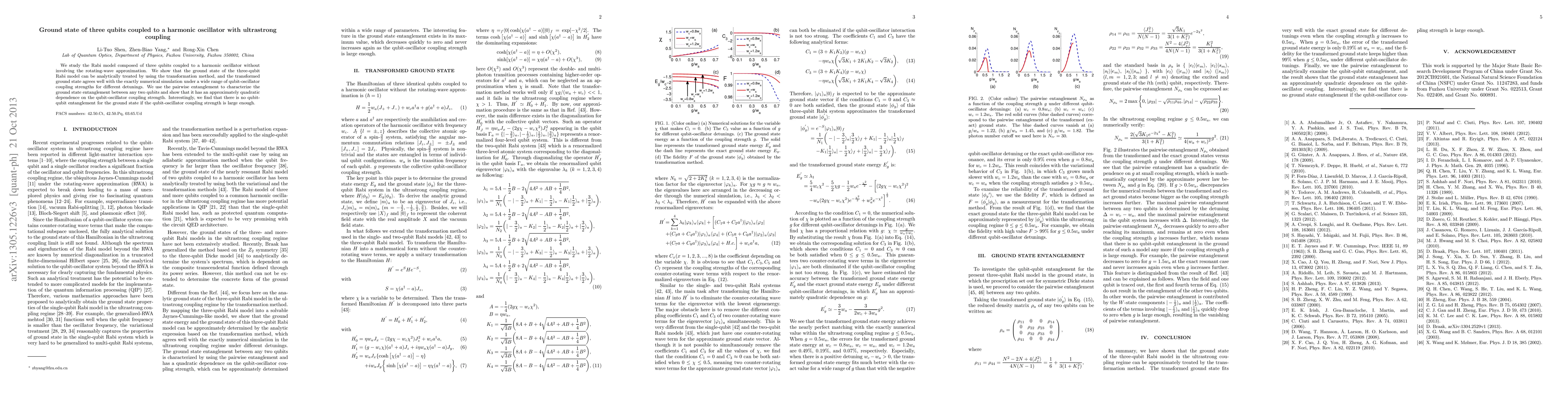This paper investigates the ground state of a three-qubit Rabi model coupled to a harmonic oscillator in ultrastrong coupling regimes, demonstrating analytical treatment via transformation methods. It reveals that the ground state exhibits approximately quadratic entanglement with the coupling strength, but no qubit-qubit entanglement when the coupling to the oscillator is sufficiently strong.