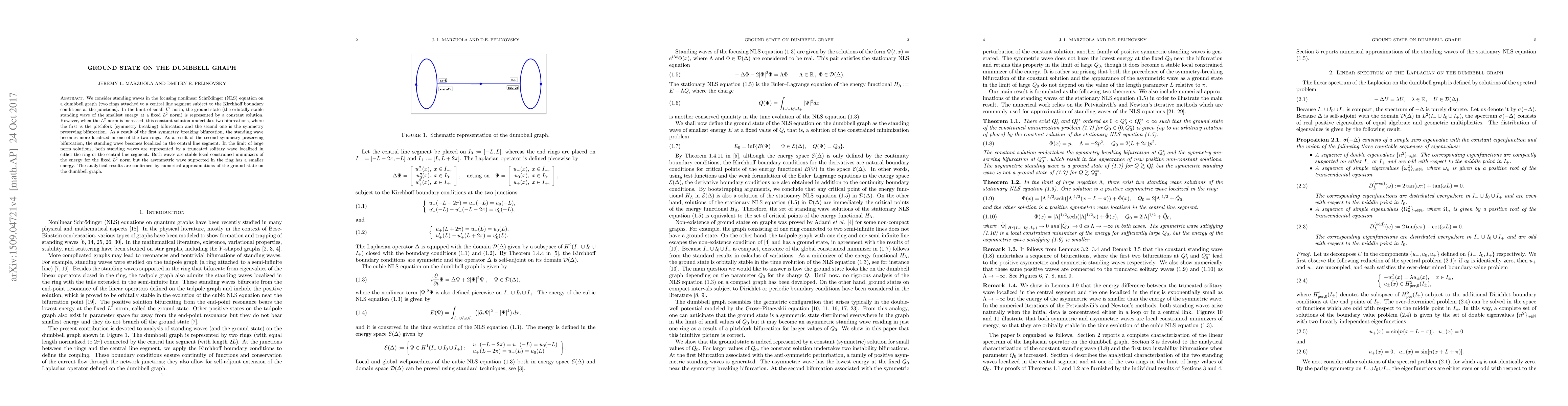 We consider standing waves in the focusing nonlinear Schr\"odinger (NLS) equation on a dumbbell graph (two rings attached to a central line segment subject to the Kirchhoff boundary conditions at the junctions). In the limit of small $L^2$ norm, the ground state (the orbitally stable standing wave of the smallest energy at a fixed $L^2$ norm) is represented by a constant solution. However, when the $L^2$ norm is increased, this constant solution undertakes two bifurcations, where the first is the pitchfork (symmetry breaking) bifurcation and the second one is the symmetry preserving bifurcation. As a result of the first symmetry breaking bifurcation, the standing wave becomes more localized in one of the two rings. As a result of the second symmetry preserving bifurcation, the standing wave becomes localized in the central line segment. In the limit of large norm solutions, both standing waves are represented by a truncated solitary wave localized in either the ring or the central line segment. Although the asymmetric wave supported in the ring is a ground state near the symmetry breaking bifurcation of the constant solution, it is the symmetric wave supported in the central line segment which becomes the ground state in the limit of large $L^2$ norm. The analytical results are confirmed by numerical approximations of the ground state on the dumbbell graph.