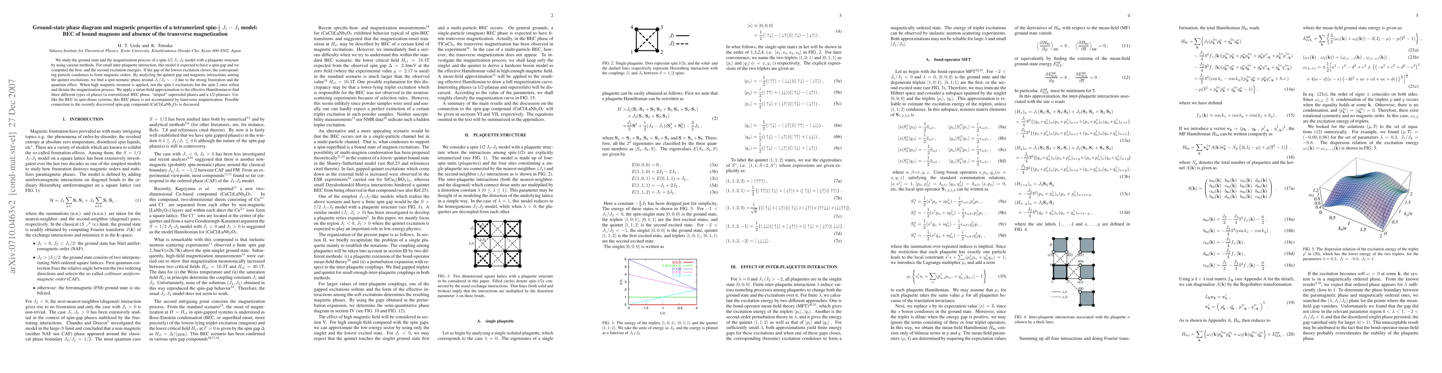 We study the ground state and the magnetization process of a spin-1/2 $J_1$-$J_2$ model with a plaquette structure by using various methods. For small inter-plaquette interaction, this model is expected to have a spin-gap and we computed the first- and the second excitation energies. If the gap of the lowest excitation closes, the corresponding particle condenses to form magnetic orders. By analyzing the quintet gap and magnetic interactions among the quintet excitations, we find a spin-nematic phase around $J_1/J_2\sim -2$ due to the strong frustration and the quantum effect. When high magnetic moment is applied, not the spin-1 excitations but the spin-2 ones soften and dictate the magnetization process. We apply a mean-field approximation to the effective Hamiltonian to find three different types of phases (a conventional BEC phase, ``striped'' supersolid phases and a 1/2-plateau). Unlike the BEC in spin-dimer systems, this BEC phase is not accompanied by transverse magnetization. Possible connection to the recently discovered spin-gap compound (CuCl)LaNb2O7 is discussed.