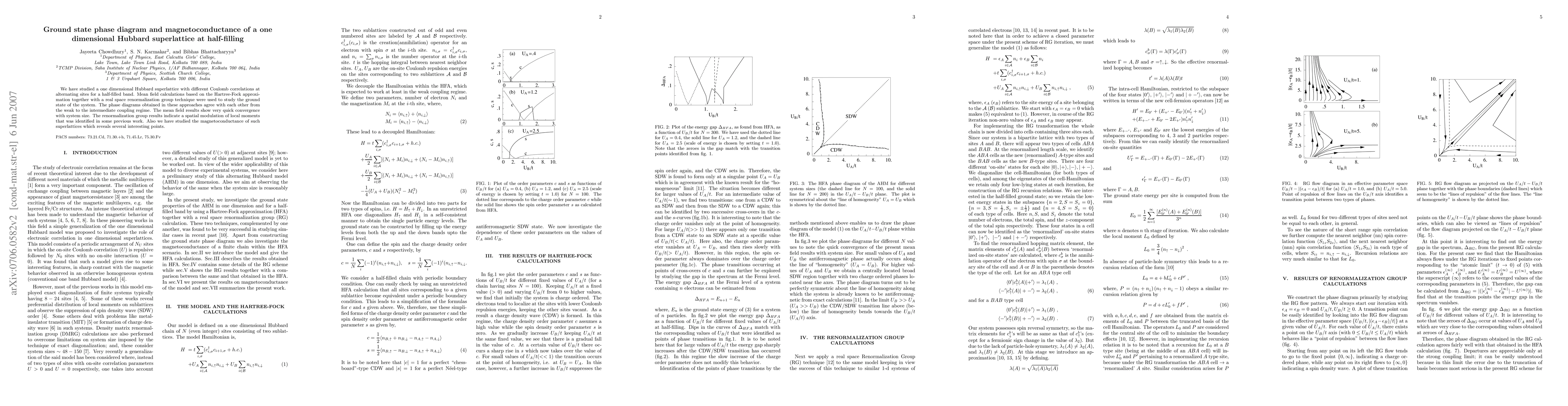 We have studied a one dimensional Hubbard superlattice with different Coulomb correlations at alternating sites for a half-filled band. Mean field calculations based on the Hartree-Fock approximation together with a real space renormalization group technique were used to study the ground state of the system. The phase diagrams obtained in these approaches agree with each other from the weak to the intermediate coupling regime. The mean field results show very quick convergence with system size. The renormalization group results indicate a spatial modulation of local moments that was identified in some previous work. Also we have studied the magnetoconductance of such superlattices which reveals several interesting points.