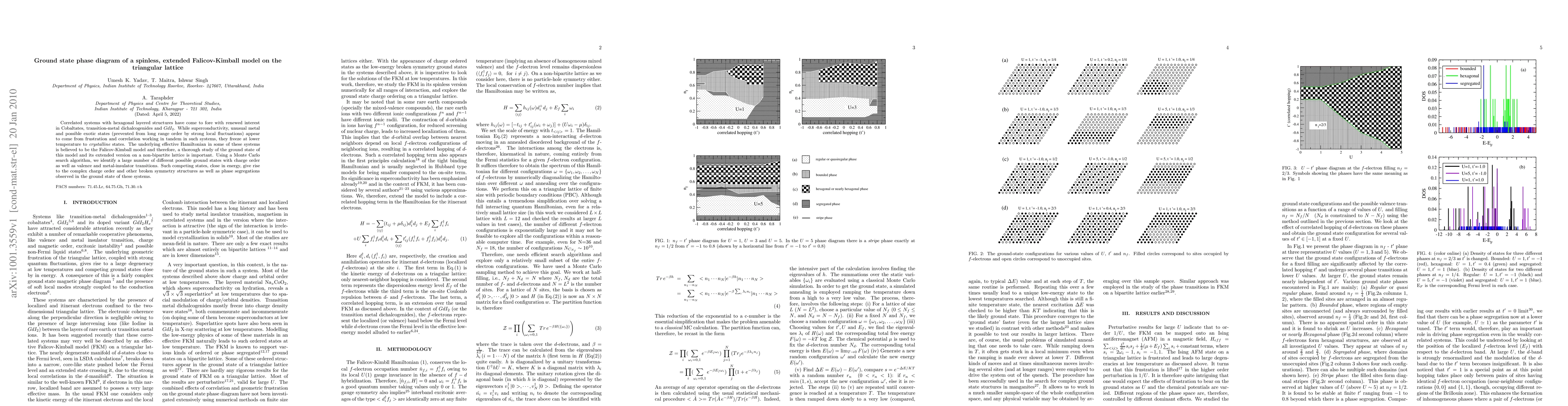 Correlated systems with hexagonal layered structures have come to fore with renewed interest in Cobaltates, transition-metal dichalcogenides and GdI2. While superconductivity, unusual metal and possible exotic states (prevented from long range order by strong local fluctuations) appear to come from frustration and correlation working in tandem in such systems, they freeze at lower temperature to crystalline states. The underlying effective Hamiltonian in some of these systems is believed to be the Falicov-Kimball model and therefore, a thorough study of the ground state of this model and its extended version on a non-bipartite lattice is important. Using a Monte Carlo search algorithm, we identify a large number of different possible ground states with charge order as well as valence and metal-insulator transitions. Such competing states, close in energy, give rise to the complex charge order and other broken symmetry structures as well as phase segregations observed in the ground state of these systems.