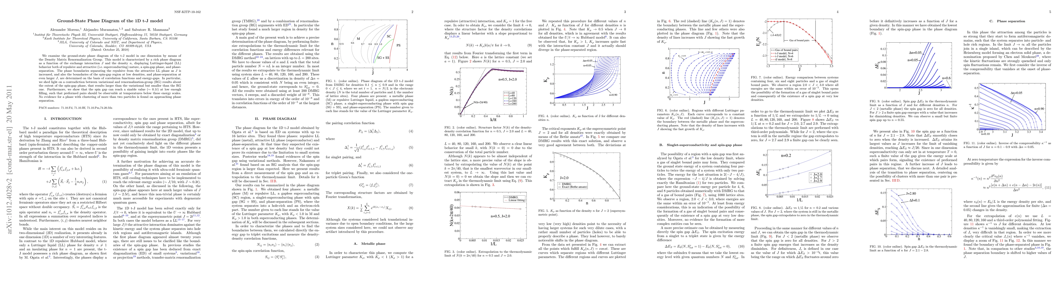 This paper explores the ground-state phase diagram of the 1D t-J model using Density Matrix Renormalization Group, identifying phases including Luttinger liquids, spin-gap, and phase separation. The study resolves discrepancies between variational and renormalization-group results regarding the spin-gap phase.