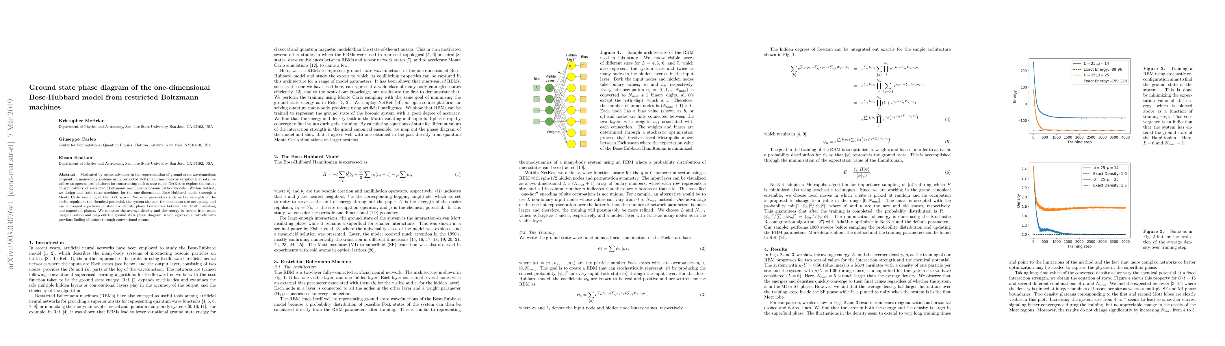 The paper explores the ground state phase diagram of the one-dimensional Bose-Hubbard model using restricted Boltzmann machines as variational ansatz, trained through NetKet. It identifies phase boundaries between Mott insulating and superfluid phases by comparing results with exact diagonalization.