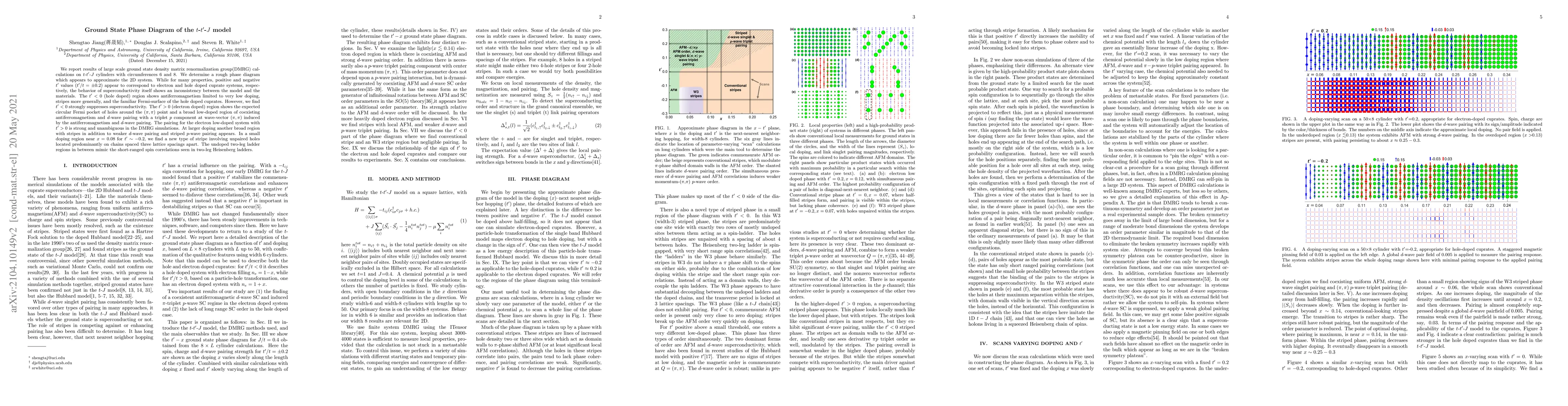 We report results of large scale ground state density matrix renormalization group(DMRG) calculations on $t$-$t'$-$J$ cylinders with circumferences 6 and 8. We determine a rough phase diagram which appears to approximate the 2D system. While for many properties, positive and negative $t'$ values ($t'/t = \pm 0.2$) appear to correspond to electron and hole doped cuprate systems, respectively, the behavior of superconductivity itself shows an inconsistency between the model and the materials. The $t'<0$ (hole doped) region shows antiferromagnetism limited to very low doping, stripes more generally, and the familiar Fermi-surface of the hole doped cuprates. However, we find $t'<0$ strongly suppresses superconductivity. The $t'>0$ (electron doped) region shows the expected circular Fermi pocket of holes around the $(\pi,\pi)$ point and a broad low-doped region of coexisting antiferromagnetism and $d$-wave pairing with a strong triplet $p$ component at wave-vector $(\pi,\pi)$ induced by the antiferromagnetism and $d$-wave pairing. The pairing for the electron low-doped system with $t'>0$ is strong and unambiguous in the DMRG simulations. At larger doping another broad region with stripes in addition to weaker $d$-wave pairing and striped $p$-wave pairing appears. In a small doping region near $x=0.08$ for $t'\sim-0.2$, we find a new type of stripe involving unpaired holes located predominantly on chains spaced three lattice spacings apart. The undoped two-leg ladder regions in between mimic the short-ranged spin correlations seen in two-leg Heisenberg ladders.