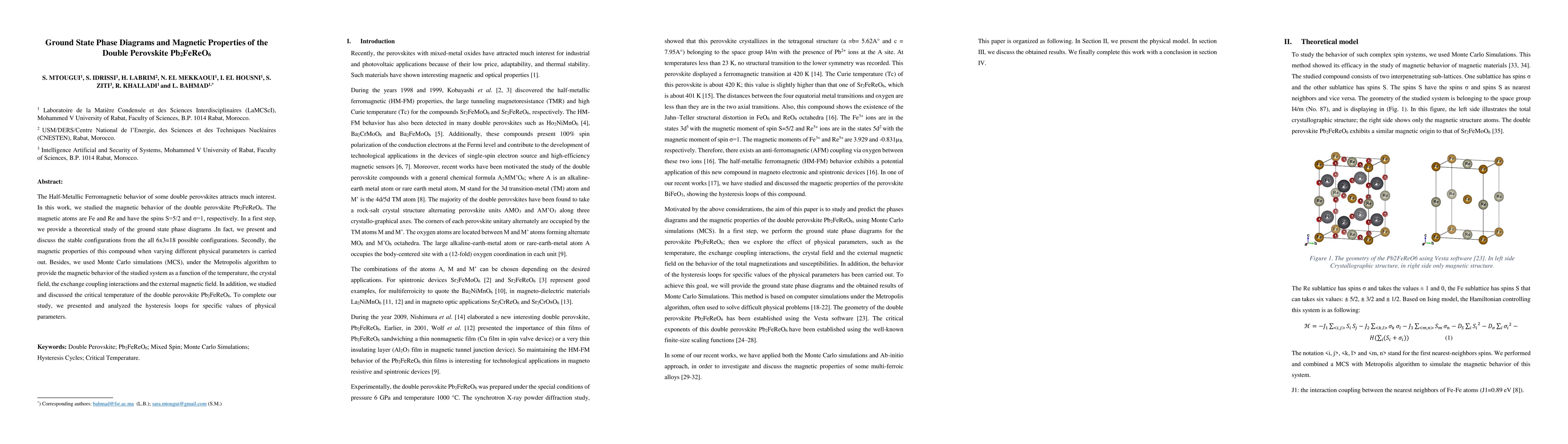 This study theoretically explores the ground state phase diagrams and magnetic properties of Pb2FeReO6, a double perovskite with potential half-metallic ferromagnetic behavior. Utilizing Monte Carlo simulations, researchers analyze the impact of temperature, crystal field, exchange coupling interactions, and external magnetic field on its magnetic behavior. They also investigate the compound's critical temperature and present hysteresis loop analysis for specific parameter values.