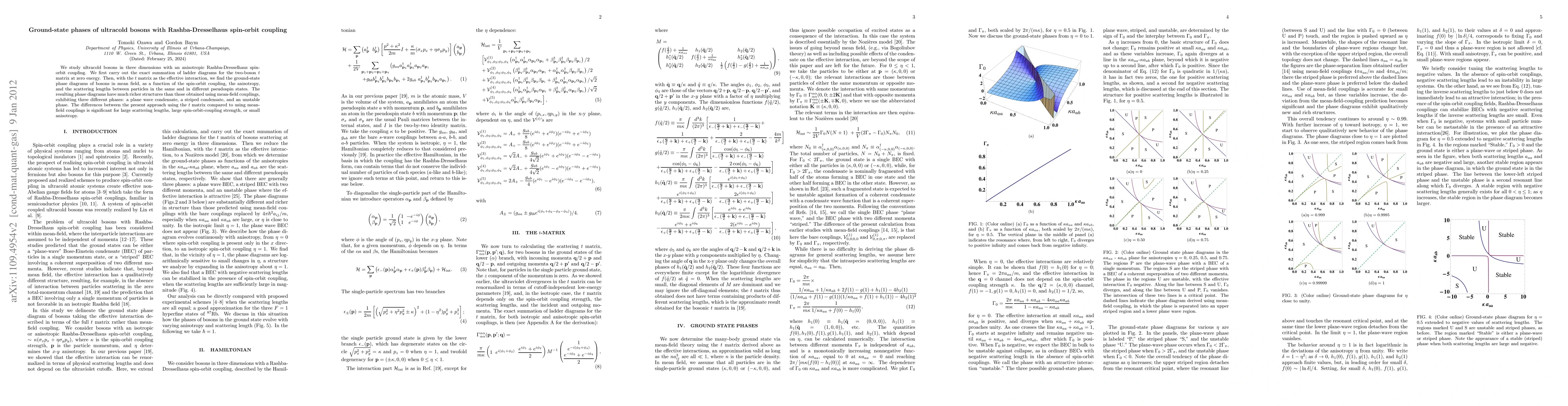 This paper investigates the ground-state phases of ultracold bosons in three dimensions under anisotropic Rashba-Dresselhaus spin-orbit coupling, revealing three distinct phases: a plane-wave condensate, a striped condensate, and an unstable phase, using an exact summation of ladder diagrams for the two-boson t-matrix. The study highlights significant differences from mean-field approaches, especially under large scattering lengths or spin-orbit coupling strengths.