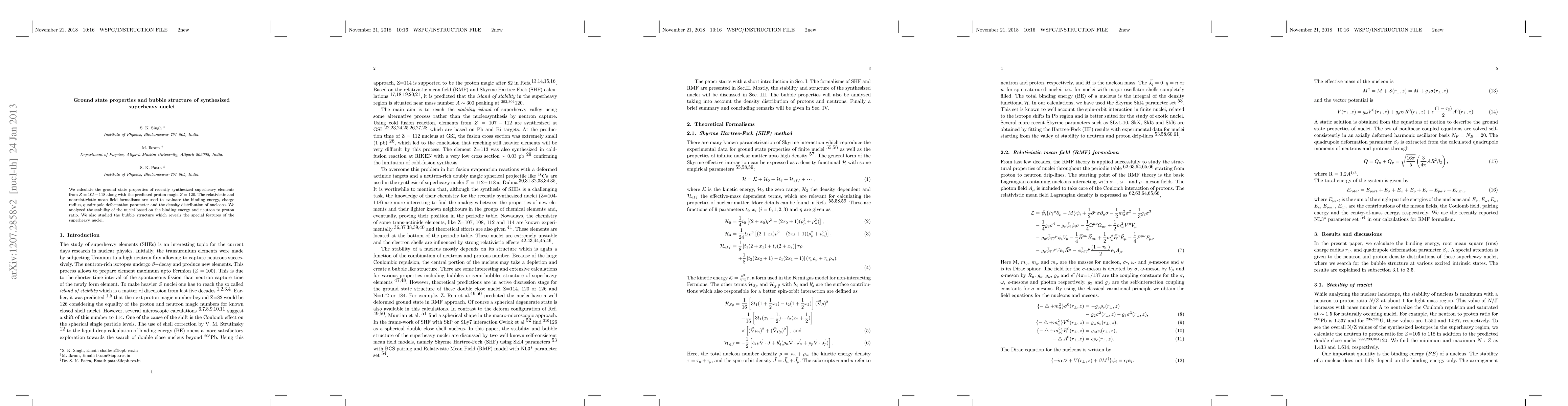We calculate the ground state properties of recently synthesized superheavy nuclei starting from $Z$=105-120. The nonrelativistic and relativistic mean field formalisms is used to evaluate the binding energy, charge radius, quadrupole deformation parameter and the density distribution of nucleons. We analyzed the stability of the nuclei based on the binding energy and neutron to proton ratio. We also studied the bubble structure of the nucleus which reveals about the special features of the superheavy nucleus.