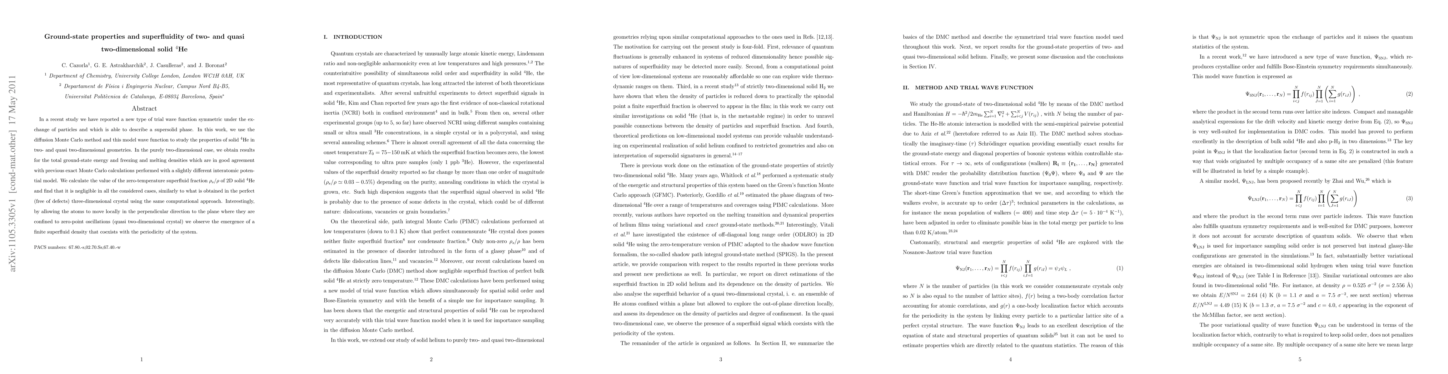 In a recent study we have reported a new type of trial wave function symmetric under the exchange of particles and which is able to describe a supersolid phase. In this work, we use the diffusion Monte Carlo method and this model wave function to study the properties of solid 4He in two- and quasi two-dimensional geometries. In the purely two-dimensional case, we obtain results for the total ground-state energy and freezing and melting densities which are in good agreement with previous exact Monte Carlo calculations performed with a slightly different interatomic potential model. We calculate the value of the zero-temperature superfluid fraction \rho_{s} / \rho of 2D solid 4He and find that it is negligible in all the considered cases, similarly to what is obtained in the perfect (free of defects) three-dimensional crystal using the same computational approach. Interestingly, by allowing the atoms to move locally in the perpendicular direction to the plane where they are confined to zero-point oscillations (quasi two-dimensional crystal) we observe the emergence of a finite superfluid density that coexists with the periodicity of the system.