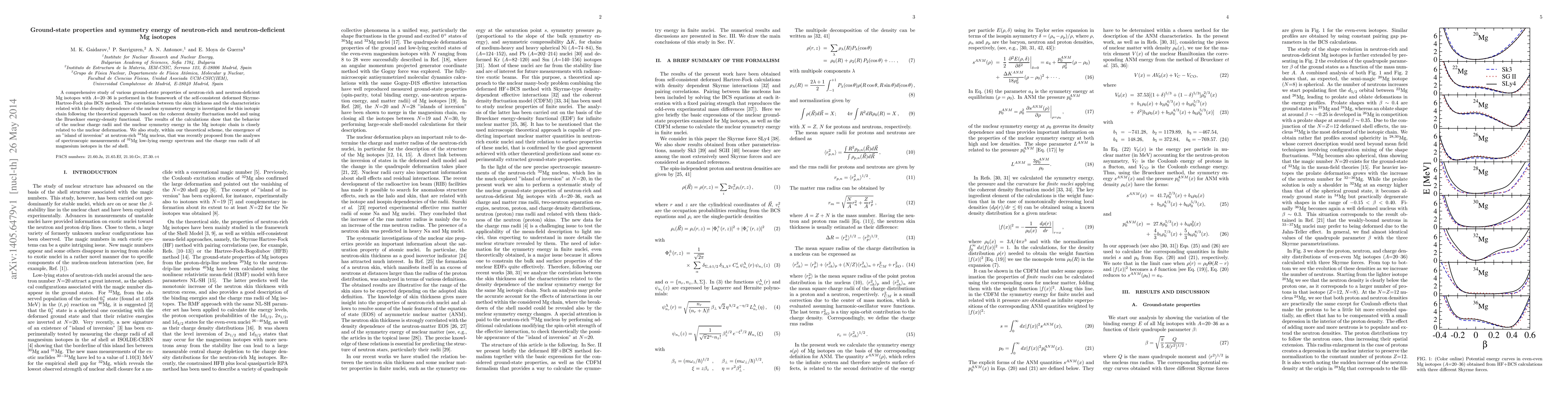 A comprehensive study of various ground-state properties of neutron-rich and neutron-deficient Mg isotopes with $A$=20-36 is performed in the framework of the self-consistent deformed Skyrme-Hartree-Fock plus BCS method. The correlation between the skin thickness and the characteristics related with the density dependence of the nuclear symmetry energy is investigated for this isotopic chain following the theoretical approach based on the coherent density fluctuation model and using the Brueckner energy-density functional. The results of the calculations show that the behavior of the nuclear charge radii and the nuclear symmetry energy in the Mg isotopic chain is closely related to the nuclear deformation. We also study, within our theoretical scheme, the emergence of an "island of inversion" at neutron-rich $^{32}$Mg nucleus, that was recently proposed from the analyses of spectroscopic measurements of $^{32}$Mg low-lying energy spectrum and the charge rms radii of all magnesium isotopes in the $sd$ shell.