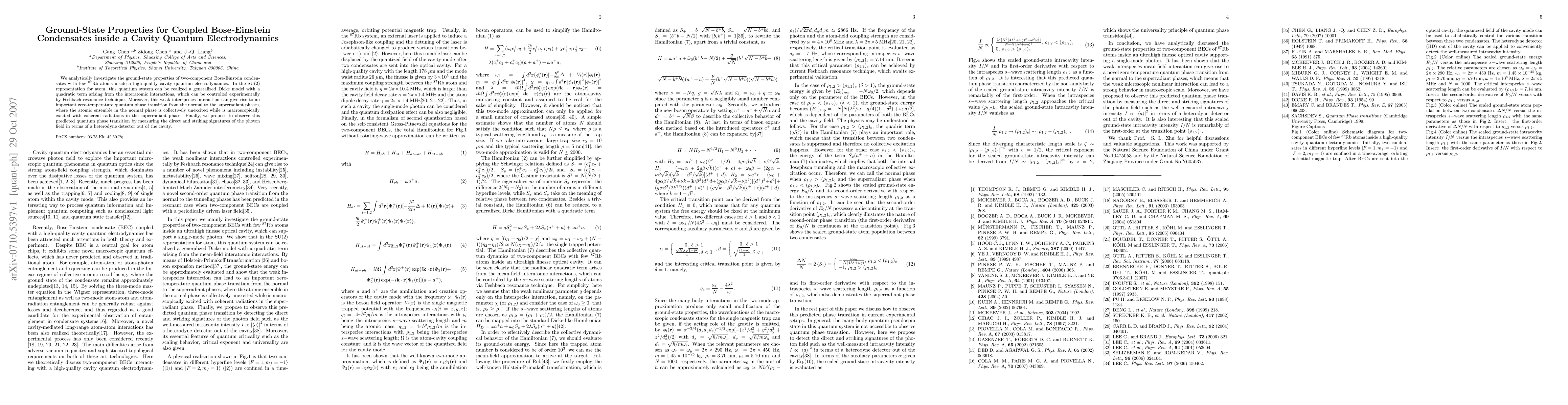 We analytically investigate the ground-state properties of two-component Bose-Einstein condensates with few ⁸⁷Rb atoms inside a high-quality cavity quantum electrodynamics. In the SU(2) representation for atom, this quantum system can be realized a generalized Dicke model with a quadratic term arising from the interatomic interactions, which can be controlled experimentally by Feshbach resonance technique. Moreover, this weak interspecies interaction can give rise to an important zero-temperature quantum phase transition from the normal to the superradiant phases, where the atomic ensemble in the normal phase is collectively unexcited while is macroscopically excited with coherent radiations in the superradiant phase. Finally, we propose to observe this predicted quantum phase transition by measuring the direct and striking signatures of the photon field in terms of a heterodyne detector out of the cavity.