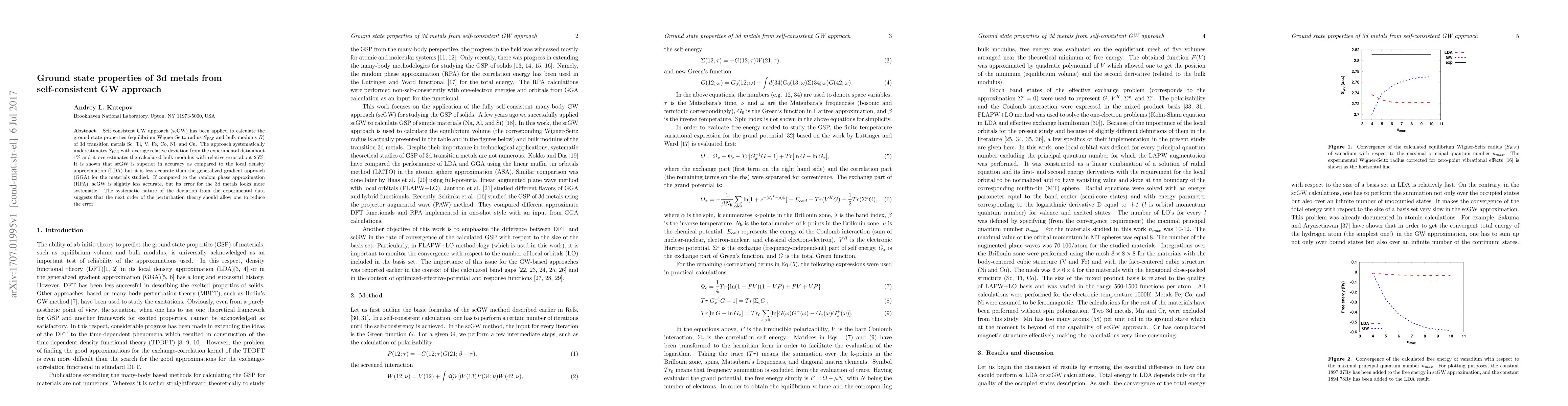 This paper applies the self-consistent GW approach to calculate the ground state properties of 3d transition metals, finding it more accurate than LDA but less than GGA, with systematic deviations suggesting room for improvement in perturbation theory.