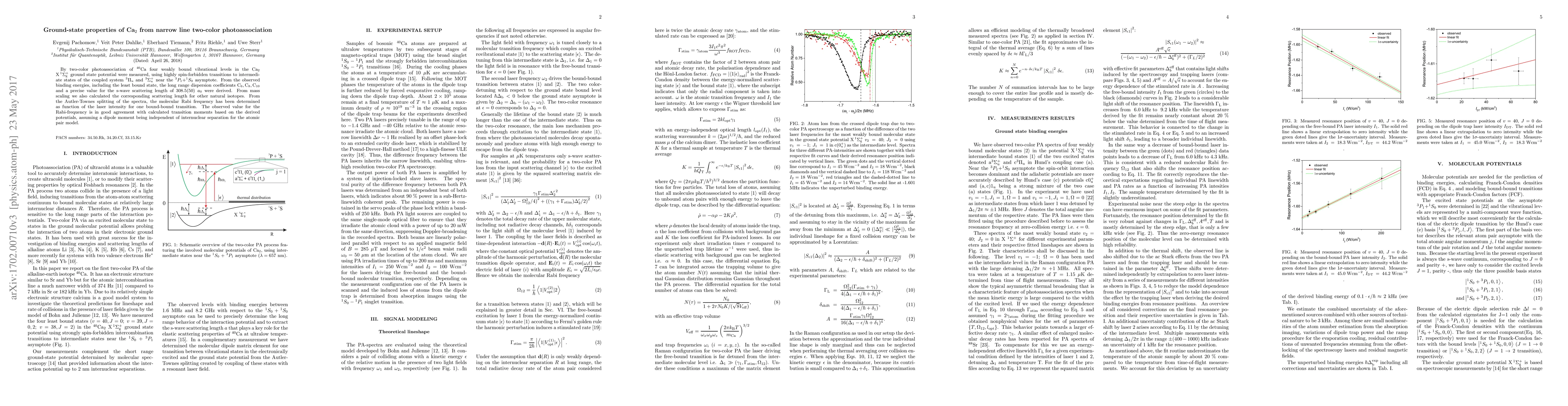 By two-color photoassociation of $^{40}$Ca four weakly bound vibrational levels in the Ca$_2$ \Xpot ground state potential were measured, using highly spin-forbidden transitions to intermediate states of the coupled system $^3\Pi_{u}$ and $^3\Sigma^+ _{u}$ near the ${^3P_1}$+${^1S_0}$ asymptote. From the observed binding energies, including the least bound state, the long range dispersion coefficients $\mathrm{C}_6, \mathrm{C}_8,\mathrm{C}_{10}$ and a precise value for the s-wave scattering length of 308.5(50)~$a_0$ were derived. From mass scaling we also calculated the corresponding scattering length for other natural isotopes. From the Autler-Townes splitting of the spectra, the molecular Rabi frequency has been determined as function of the laser intensity for one bound-bound transition. The observed value for the Rabi-frequency is in good agreement with calculated transition moments based on the derived potentials, assuming a dipole moment being independent of internuclear separation for the atomic pair model.