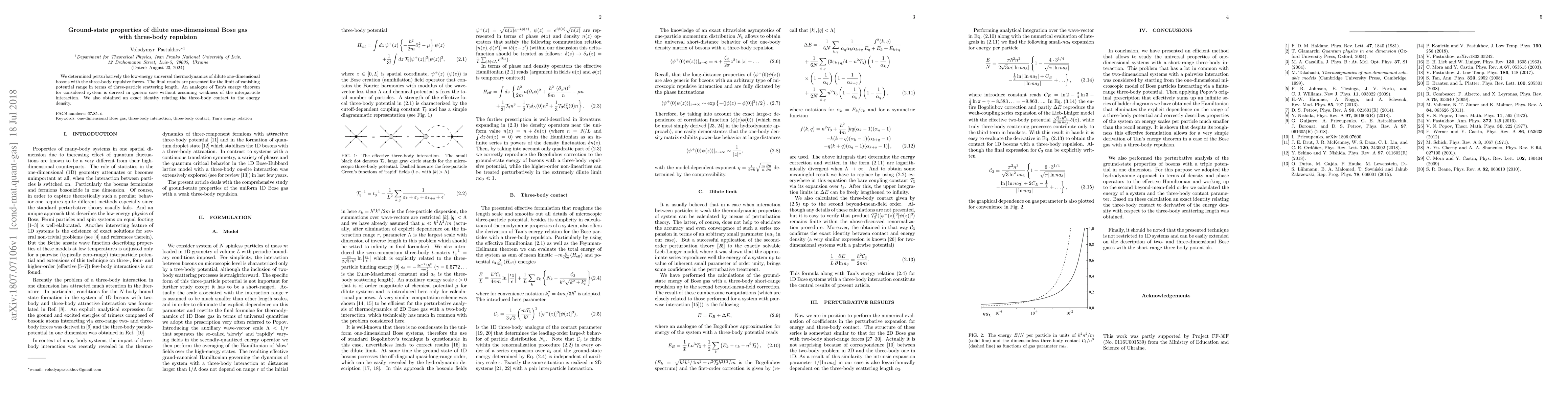 We determined perturbatively the low-energy universal thermodynamics of dilute one-dimensional bosons with the three-body repulsive forces. The final results are presented for the limit of vanishing potential range in terms of three-particle scattering length. An analogue of Tan`s energy theorem for considered system is derived in generic case without assuming weakness of the interparticle interaction. We also obtained an exact identity relating the three-body contact to the energy density.
