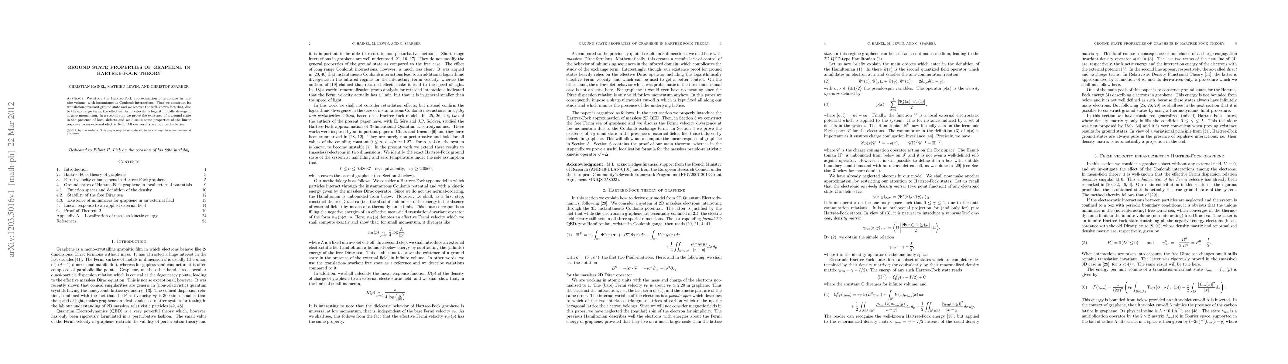 This paper explores the Hartree-Fock approximation for graphene, demonstrating the logarithmic divergence of the effective Fermi velocity due to the exchange term. It also proves the existence of a ground state with local defects and discusses the linear response to external electric fields, all without perturbative methods.