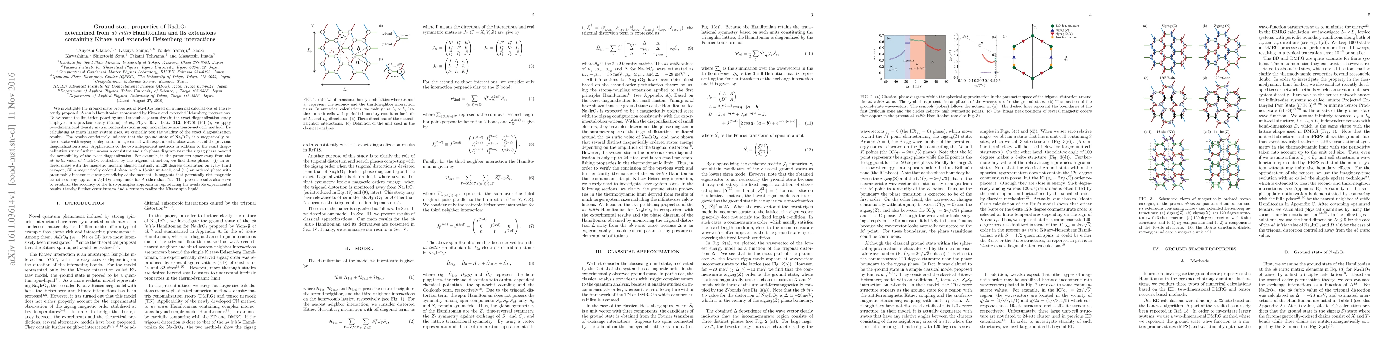 We investigate the ground state properties of $\mathrm{Na_2IrO_3}$ based on numerical calculations of the recently proposed {\it ab initio} Hamiltonian represented by Kitaev and extended Heisenberg interactions. To overcome the limitation posed by small tractable system sizes in the exact diagonalization study employed in a previous study (Yamaji $\textit{et al.}$, Phys. Rev. Lett. $\textbf{113}$, 107201 (2014)), we apply two-dimensional density matrix renomalization group, and infinite-size tensor-network method. By calculating at much larger system sizes, we critically test the validity of the exact diagonalization results. The results consistently indicate that the ground state of $\mathrm{Na_2IrO_3}$ is a magnetically ordered state with zigzag configuration in agreement with experimental observations and the previous diagonalization study. Applications of the two independent methods in addition to the exact diagonalization study further uncover a consistent and rich phase diagram near the zigzag phase beyond the accessibility of the exact diagonalization. For example, in the parameter space away from the $\textit{ab initio}$ value of $\mathrm{Na_2IrO_3}$ controlled by the trigonal distortion, we find three phases: (i) an ordered phase with the magnetic moment aligned mutually in $120$ degrees orientation on every third hexagon, (ii) a magnetically ordered phase with a $16$-site unit-cell, and (iii) an ordered phase with presumably incommensurate periodicity of the moment. It suggests that potentially rich magnetic structures may appear in $A_\mathrm{2}\mathrm{IrO_3}$ compounds for $A$ other than Na. The present results also serve to establish the accuracy of the first-principles approach in reproducing the available experimental results thereby further contribute to find a route to realize the Kitaev spin liquid.