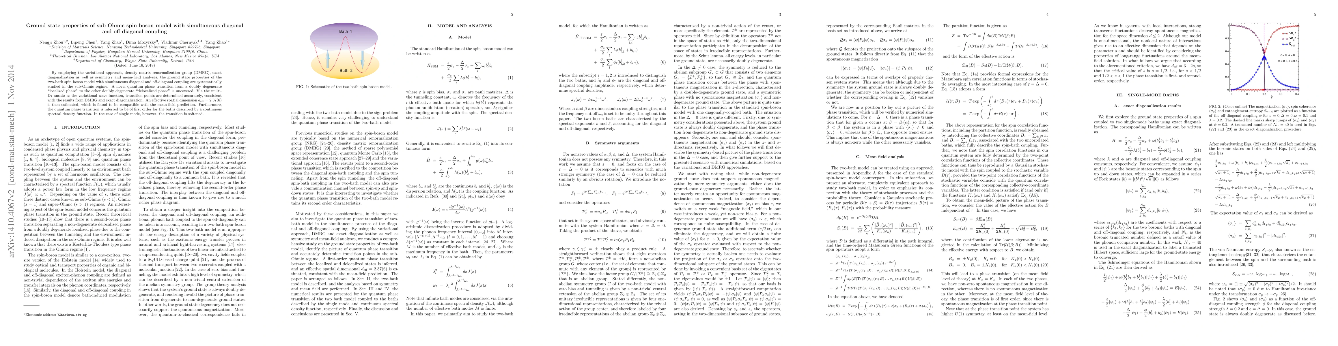 This paper investigates the ground state properties of a sub-Ohmic spin-boson model with both diagonal and off-diagonal couplings using variational methods, DMRG, and exact diagonalization. It reveals a novel first-order quantum phase transition between two doubly degenerate phases and estimates an effective spatial dimension of $d_{eff} = 2.37(6)$.