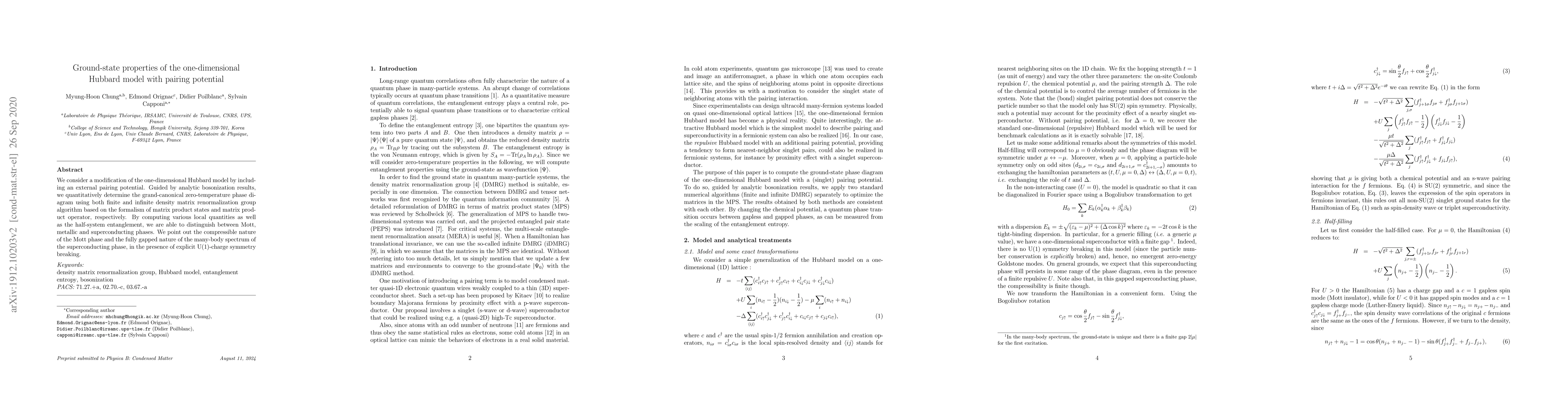 The study investigates the one-dimensional Hubbard model with pairing potential, revealing a phase diagram with distinct Mott, metallic, and superconducting phases. It shows compressibility in the Mott phase and fully gapped spectrum in the superconducting phase.