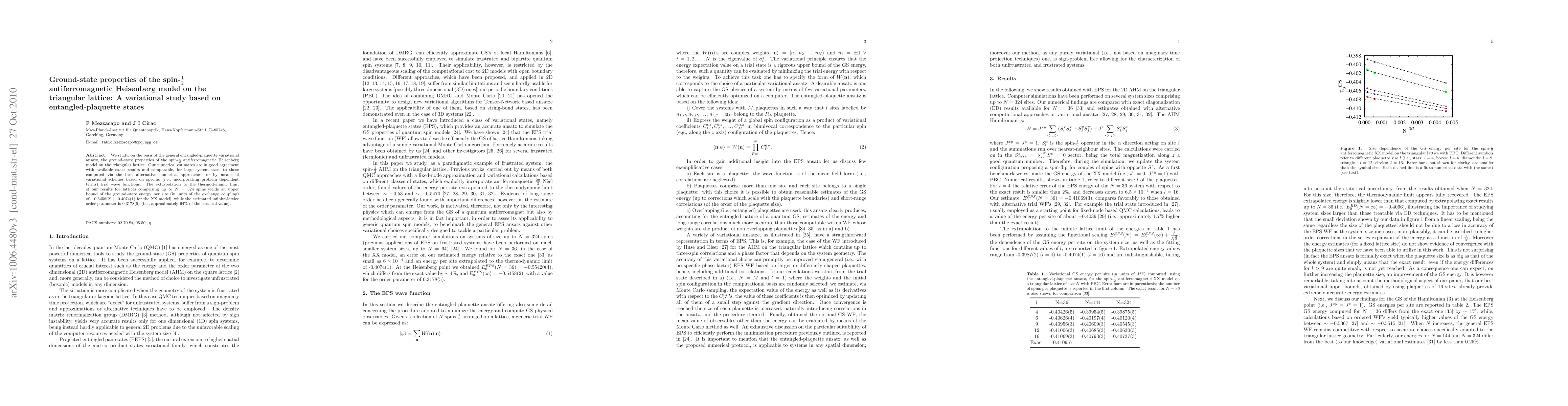 This paper investigates the ground-state properties of the spin-1/2 antiferromagnetic Heisenberg model on a triangular lattice using an entangled-plaquette variational method. The results show good agreement with exact values and competitive accuracy with other numerical approaches.