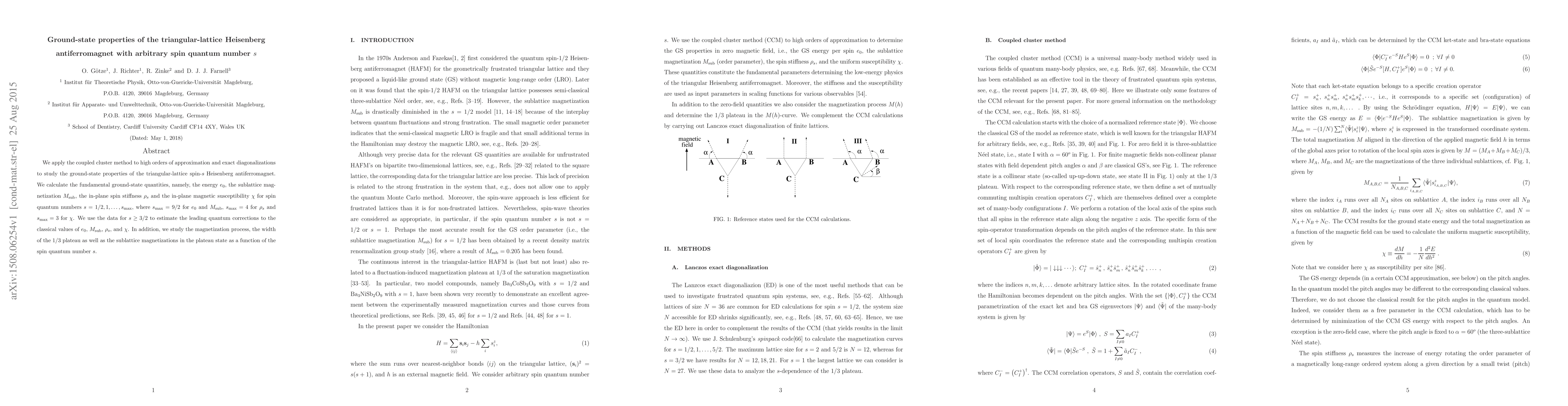This paper investigates the ground-state properties of the triangular-lattice Heisenberg antiferromagnet using coupled cluster methods and exact diagonalizations for various spin quantum numbers. It calculates key quantities like energy, magnetization, and spin stiffness, and estimates quantum corrections for higher spin values.