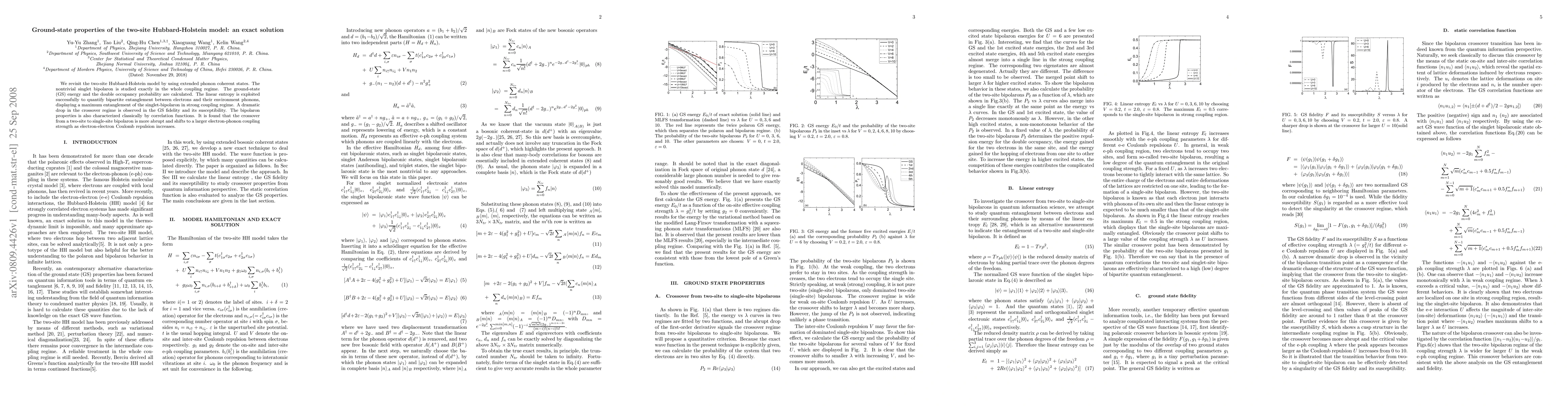 This paper provides an exact solution for the ground-state properties of the two-site Hubbard-Holstein model using extended phonon coherent states, revealing maximum bipartite entanglement in the strong coupling regime and a dramatic drop in ground-state fidelity and susceptibility during the crossover regime. The study also characterizes bipolaron properties through classical correlation functions.