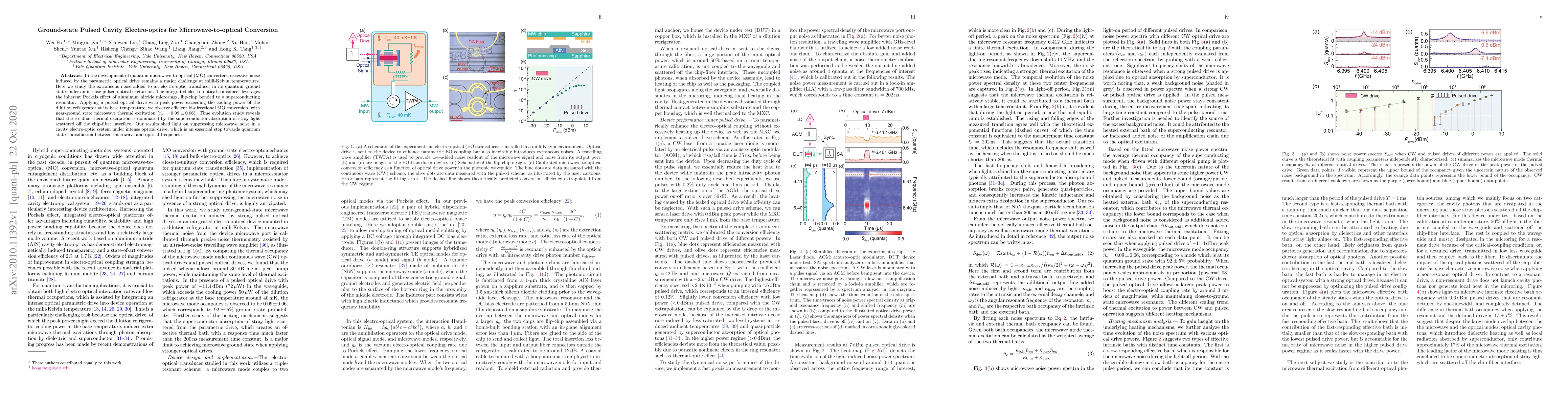 In the development of quantum microwave-to-optical (MO) converters, excessive noise induced by the parametric optical drive remains a major challenge at milli-Kelvin temperatures. Here we study the extraneous noise added to an electro-optic transducer in its quantum ground state under an intense pulsed optical excitation. The integrated electro-optical transducer leverages the inherent Pockels effect of aluminum nitride microrings, flip-chip bonded to a superconducting resonator. Applying a pulsed optical drive with peak power exceeding the cooling power of the dilution refrigerator at its base temperature, we observe efficient bi-directional MO conversion, with near-ground state microwave thermal excitation ($\bar{n}_\mathrm{e}=0.09\pm0.06$). Time evolution study reveals that the residual thermal excitation is dominated by the superconductor absorption of stray light scattered off the chip-fiber interface. Our results shed light on suppressing microwave noise in a cavity electro-optic system under intense optical drive, which is an essential step towards quantum state transduction between microwave and optical frequencies.