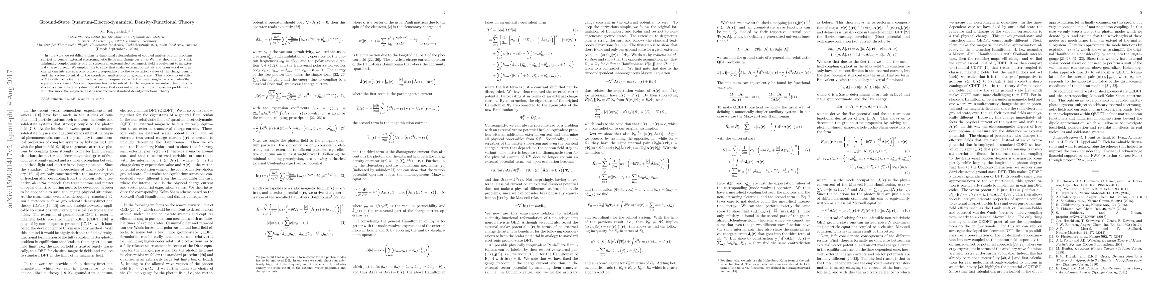 This paper reformulates coupled matter-photon systems under electromagnetic fields using density-functional theory, establishing a Maxwell-Kohn-Sham approach that correlates scalar potentials and charge currents to the ground state's charge density and vector potential, avoiding non-uniqueness issues in magnetic mean-field scenarios.